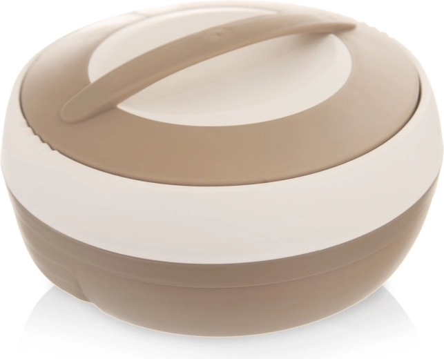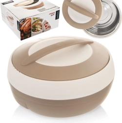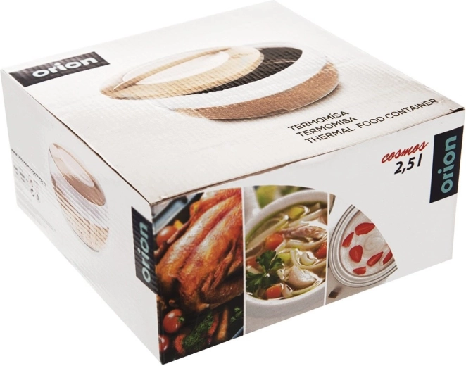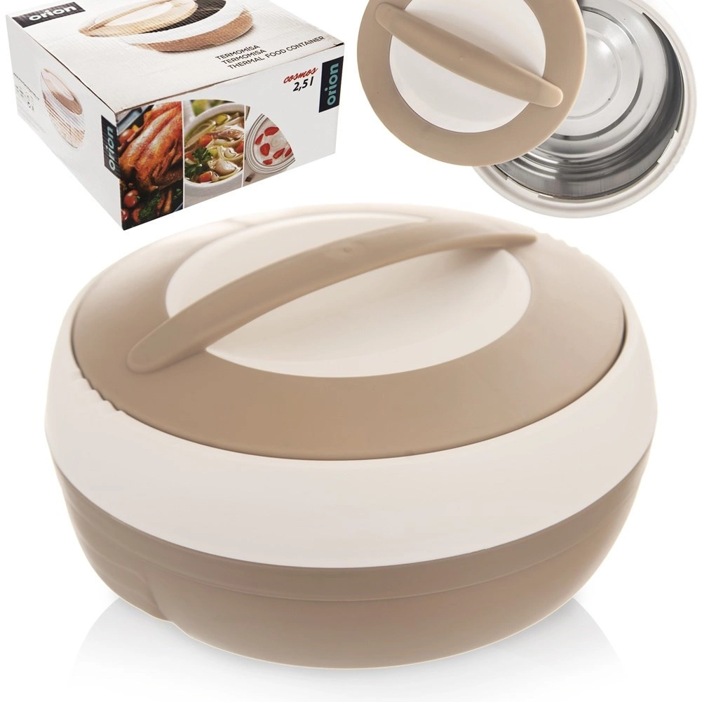 Praktische thermosschaal met een inhoud van 2,5 l voor het bewaren van zowel warme als koude gerechten. Dankzij de binnenlaag van roestvrij staal en het eenvoudig te sluiten deksel met handgreep blijft het eten tot wel 2 uur warm. Licht, duurzaam en ideaal om mee te nemen voor lunches, soepen en desserts. Origineel product van het merk ORION.