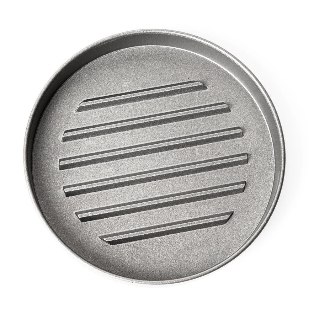 De geribbelde bodem zorgt voor een uniforme vorm en dikte, zodat de burgers gelijkmatig garen en er professioneel uitzien.