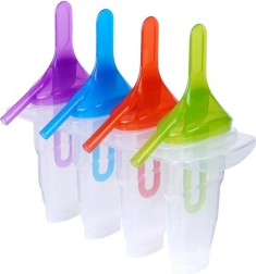 De gekoppelde basis houdt alle 4 de vormen bij elkaar, zodat ze bij het inschenken van sap of yoghurt niet omvallen en veilig rechtop in de vriezer staan.