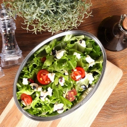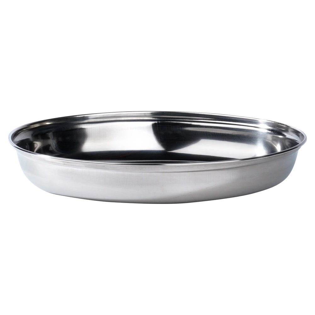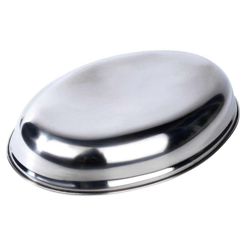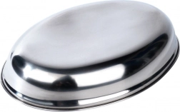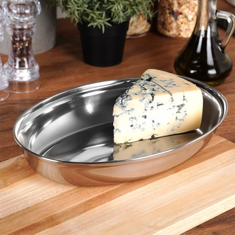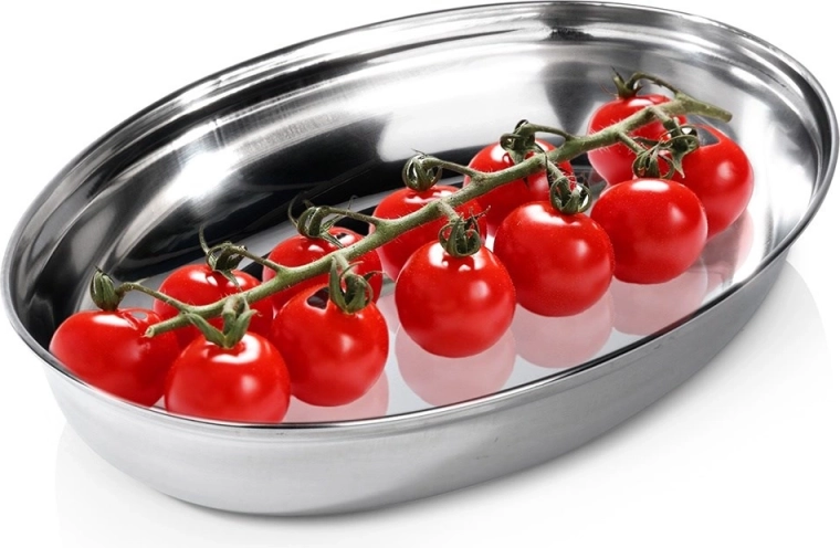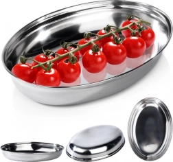 Elegante ovale schaal van hoogwaardig roestvrij staal met afmetingen 25,5 × 18 × 4 cm, ideaal voor het serveren van gerechten, voorgerechten en snacks. Dankzij het duurzame materiaal is hij onbreekbaar, hygiënisch en makkelijk te reinigen, wat u zowel thuis als in de professionele horeca zult waarderen. Universeel inzetbaar in de keuken, op tuinfeesten en onderweg.