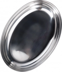 Praktische en stijlvolle ovale serveerschaal met diepe profilering, gemaakt van roestvrij staal in een elegante zilverkleurige afwerking. Bestand tegen stoten en dagelijks gebruik, een uitstekend alternatief voor glazen kommen en borden. Het gladde oppervlak is eenvoudig schoon te houden en veilig voor contact met voedsel.