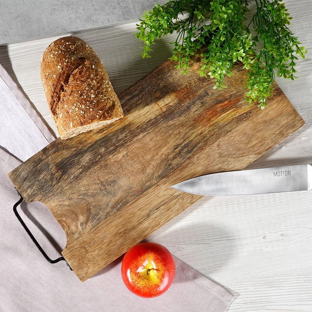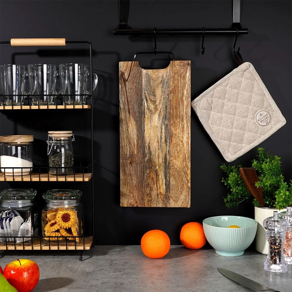 Het geïntegreerde metalen handvat maakt dragen en ophangen aan een rail eenvoudig, zodat je de plank altijd bij de hand hebt en het werkblad schoon blijft en beschermd tegen krassen. Elk stuk is uniek met een natuurlijke houttekening.