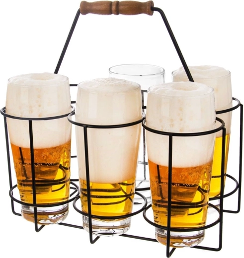 Praktische metalen houder voor flessen en glazen met 6 vakken die drankjes veilig van elkaar scheidt en botsingen voorkomt. Dankzij de stevige metalen constructie en de comfortabele houten handgreep draag je eenvoudig tot 6 flessen – ideaal voor bier, barbecue, tuin en uitstapjes. Stijlvolle uitstraling en betrouwbare stabiliteit voor dagelijks gebruik.