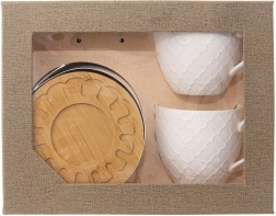 Geef je koffiemoment een upgrade met een stijlvolle set die wit porselein en natuurlijk bamboe combineert. De kopjes met elegant reliëf vullen elke tafelsetting prachtig aan en dankzij het comfortabele oor liggen ze uitstekend in de hand. De set is praktisch voor dagelijks gebruik en tegelijk representatief voor feestelijke gelegenheden.