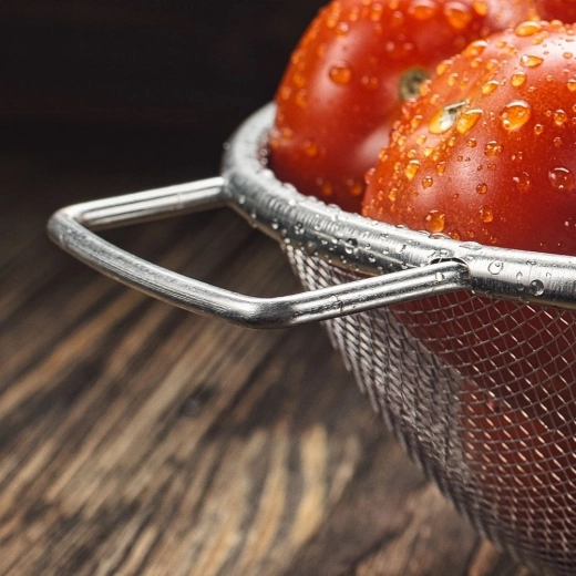 Het fijne RVS vlechtwerk houdt betrouwbaar ook kleine stukjes voedsel tegen en zorgt tegelijk voor een snelle waterafvoer – ideaal voor rijst, pasta en klein fruit.
