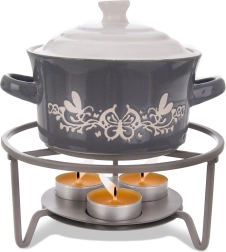 De diameter van 16,5 cm en ruimte voor 3 theelichtjes houden dranken en gerechten aangenaam warm. Geschikt voor theepotten, infusers en kleine fonduepannetjes.