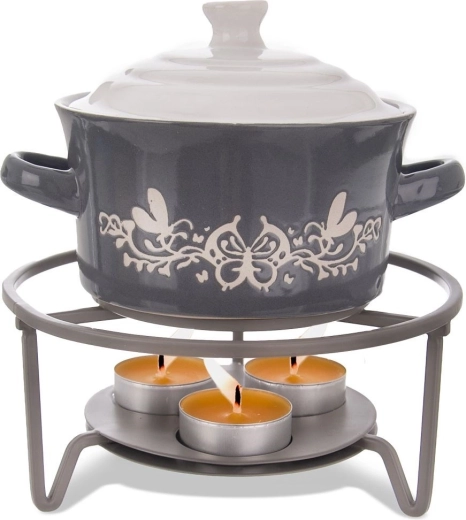 Universele metalen verwarmer in grijs die je koffie en thee langer warm houdt direct op tafel. Dankzij de diameter van 16,5 cm is hij geschikt voor theepotten, kannen, french presses en infusers. Plaats voor drie theelichtjes zorgt voor gelijkmatige, milde warmte, terwijl de stabiele metalen constructie veiligheid en een lange levensduur biedt. Het klassieke design past moeiteloos in elk interieur en is ook ideaal voor de bereiding van fondue in kleine keramische of stalen schaaltjes.