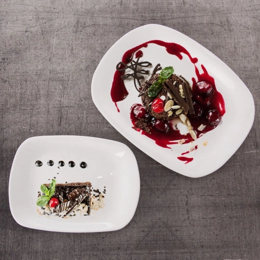 Stijlvol rechthoekig bord van wit glas dat geserveerde gerechten prachtig accentueert en naadloos past bij elke tafelsetting. Dankzij het gladde, glanzende oppervlak presenteert het eten mooi en is het bord makkelijk schoon te maken.