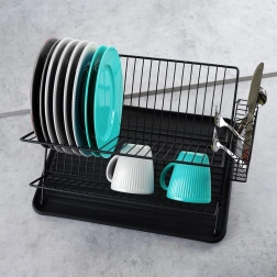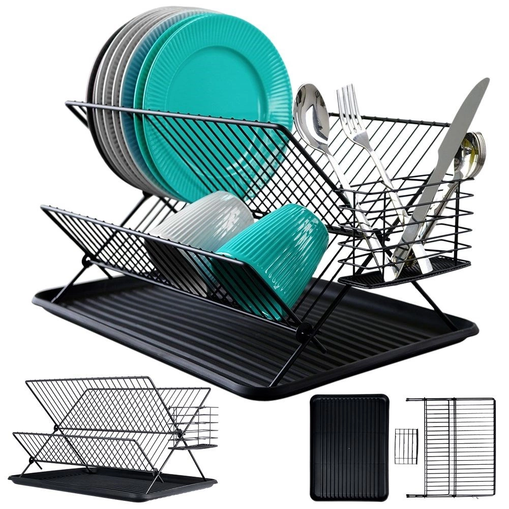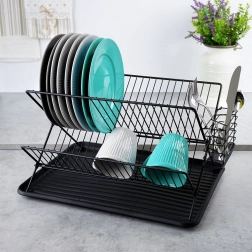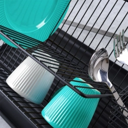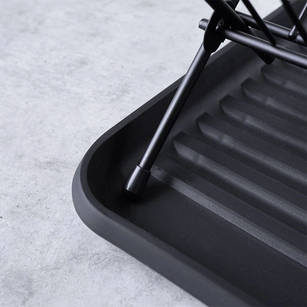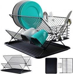 Het afdruiprek is gemaakt van duurzaam metaal in elegant zwart, heeft antislipvoetjes voor stabiliteit en een uitneembare kunststof lekbak voor gemakkelijk legen en reinigen. De inklapbare constructie bespaart ruimte wanneer je niet de volledige capaciteit nodig hebt.