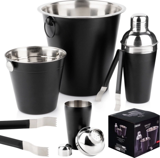 Elegante 4-delige barset van hoogwaardig roestvrij staal in matte zwarte uitvoering voor thuisbar en professioneel gebruik. Bevat een shaker, een groot koelvat voor een fles, een kleiner ijsvat en ijstang. Dankzij het roestvrijstalen ontwerp is hij duurzaam, hygiënisch en gemakkelijk te reinigen, terwijl het zwarte oppervlak uw presentatie stijl en effect geeft.