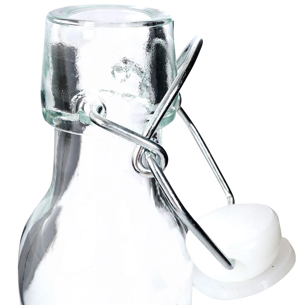 Deze compacte fles in retrostijl is gemaakt van hoogwaardig helder glas en is perfect voor olijfolie, gearomatiseerde oliën, huisgemaakte likeuren, wijn of vruchtensiropen. De metalen beugel met siliconen afdichting creëert een luchtdichte sluiting, die lekken voorkomt en helpt het aroma en de smaak te behouden.