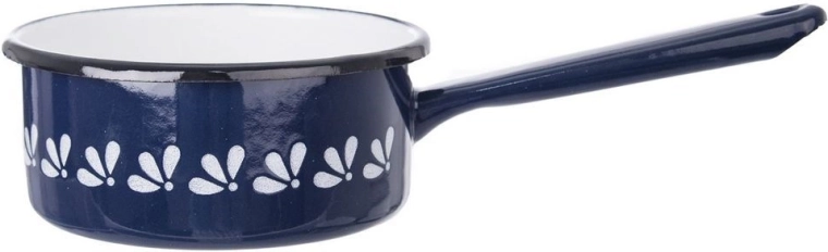 Praktisch geëmailleerd steelpannetje met lange handgreep, inhoud 600 ml en diameter 12 cm, in elegant donkerblauw met wit decor. Geschikt voor alle soorten kookplaten, inclusief inductie, ideaal voor opwarmen, koken en stoven van kleinere porties. Het duurzame oppervlak van geëmailleerd staal is gemakkelijk te reinigen en gezondheidsvriendelijk.