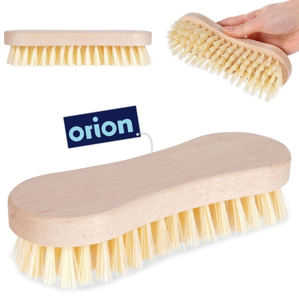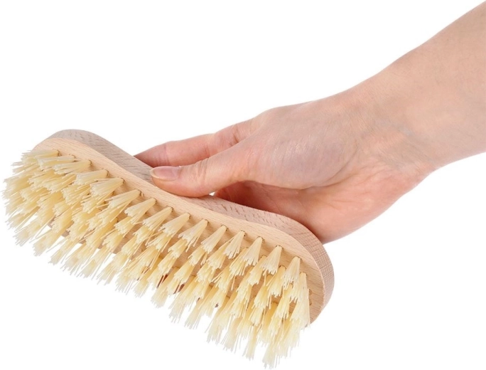 De gebogen vorm van het houten lichaam ligt prettig in de hand en zorgt voor een veilige, stabiele greep, zelfs bij intensief schrubben.