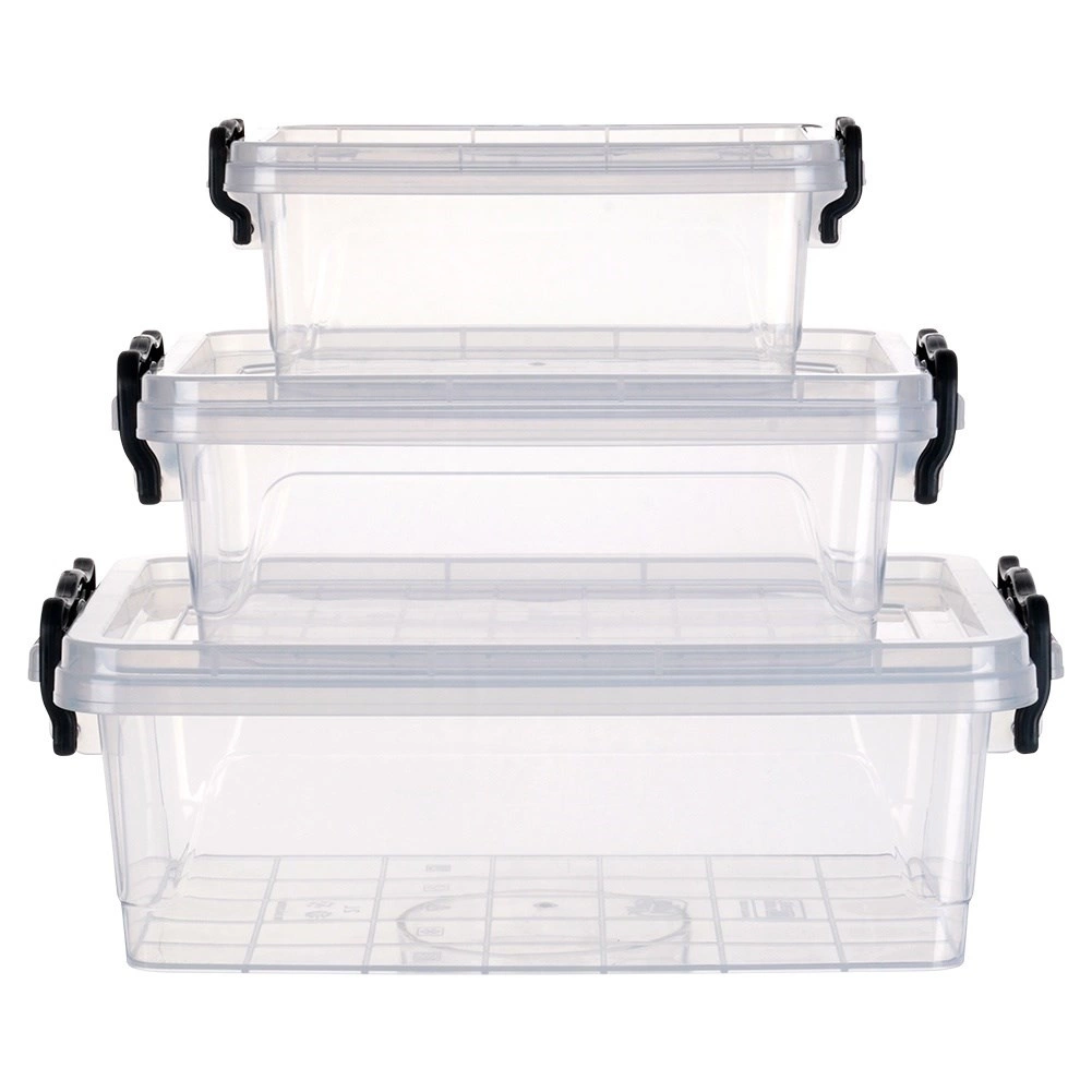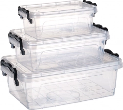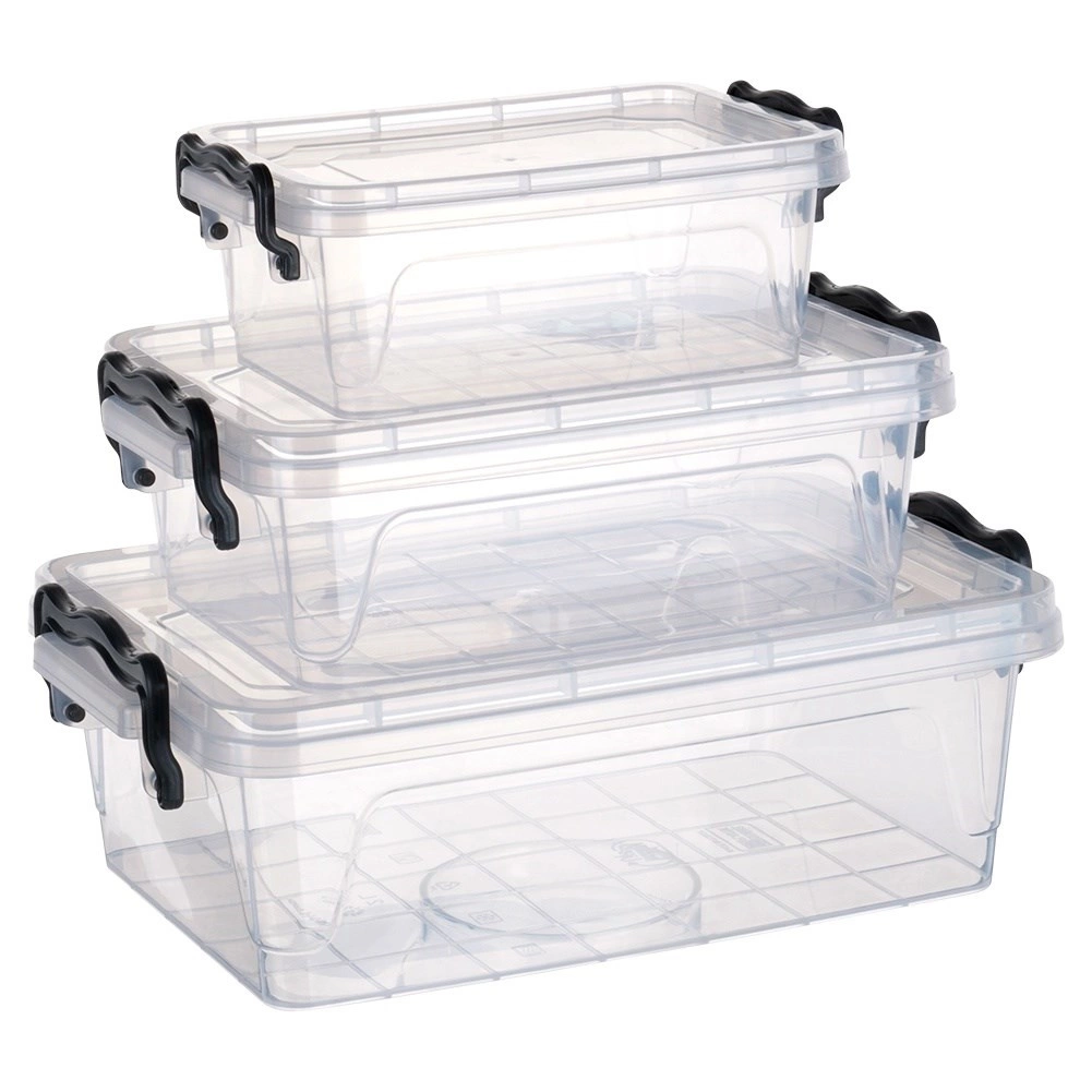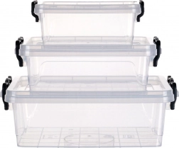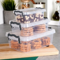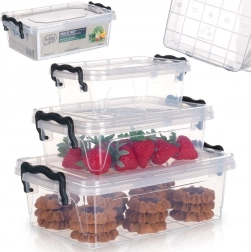 Set van drie duurzame bakjes van hoogwaardige transparante kunststof, zodat je de inhoud altijd in het oog hebt en de keuken perfect georganiseerd blijft. Stevige deksels met twee zijclips zorgen voor een strakke afsluiting en een langere versheid van voedsel.