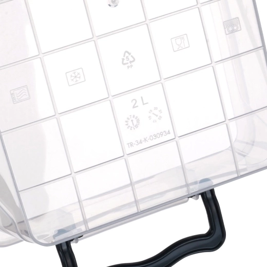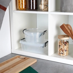 Heldere wanden maken directe controle van de inhoud mogelijk. Rechte lijnen en stevige randen zorgen voor stabiel stapelen en ruimtebesparing in voorraadkast en koelkast.