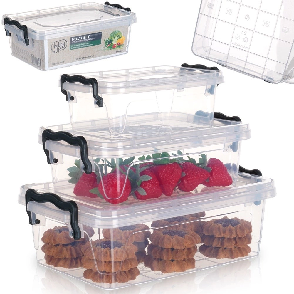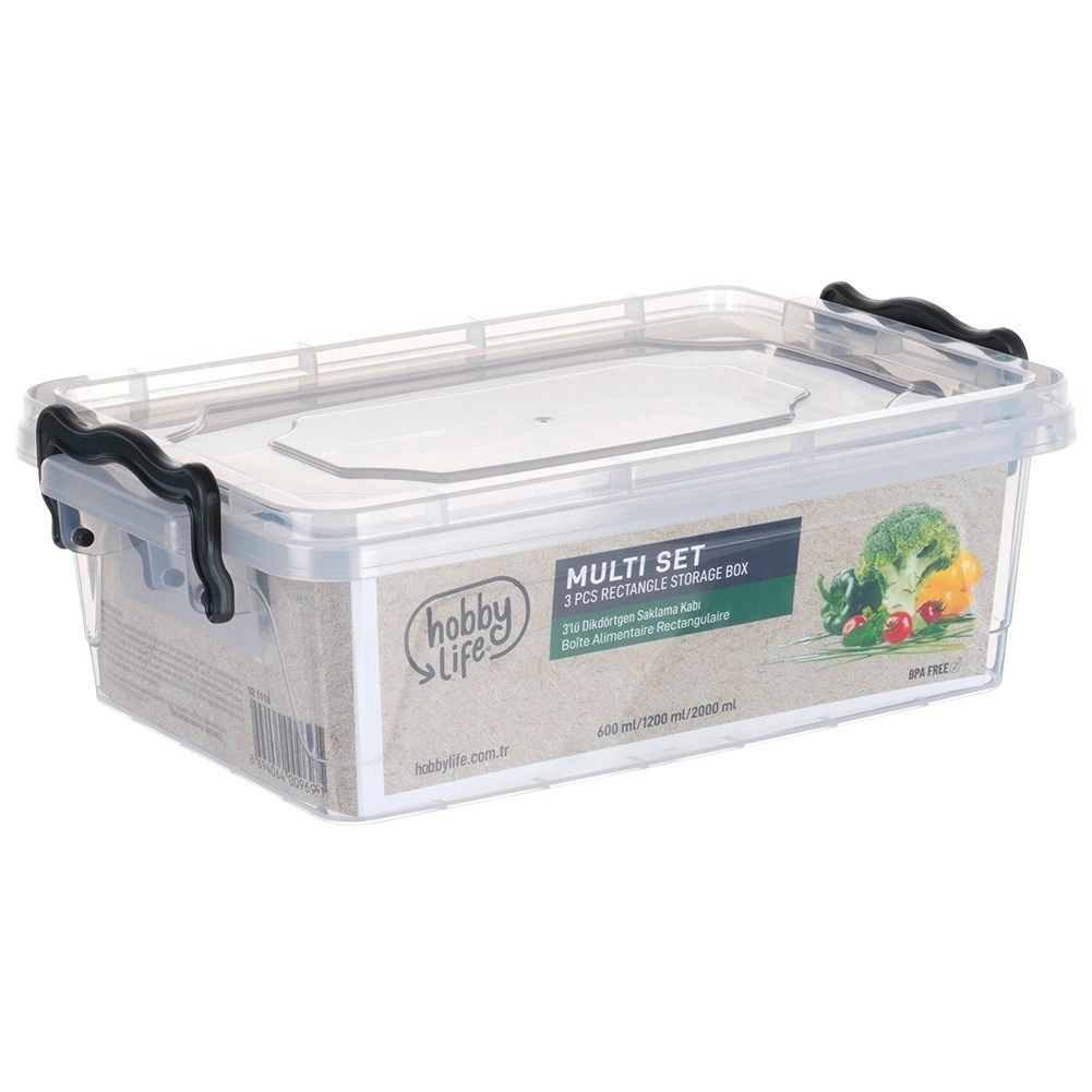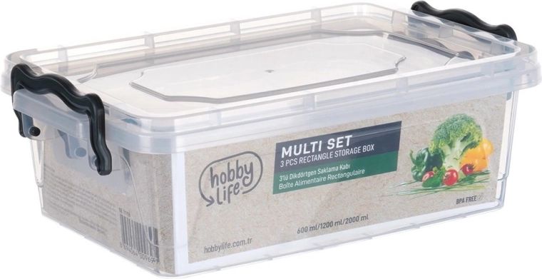 Praktische set van drie transparante voedseldozen met een inhoud van 600 ml, 1,2 l en 2 l met betrouwbare clipdeksels. De bakjes zijn luchtdicht, BPA-vrij en geschikt voor de vaatwasser, magnetron (tot +95 °C), koelkast en vriezer (tot −25 °C). Ideaal voor het behouden van versheid, meenemen en het organiseren van etenswaren thuis en op kantoor.