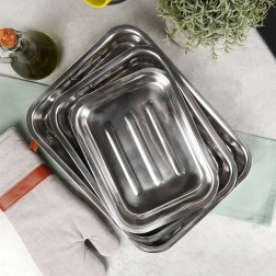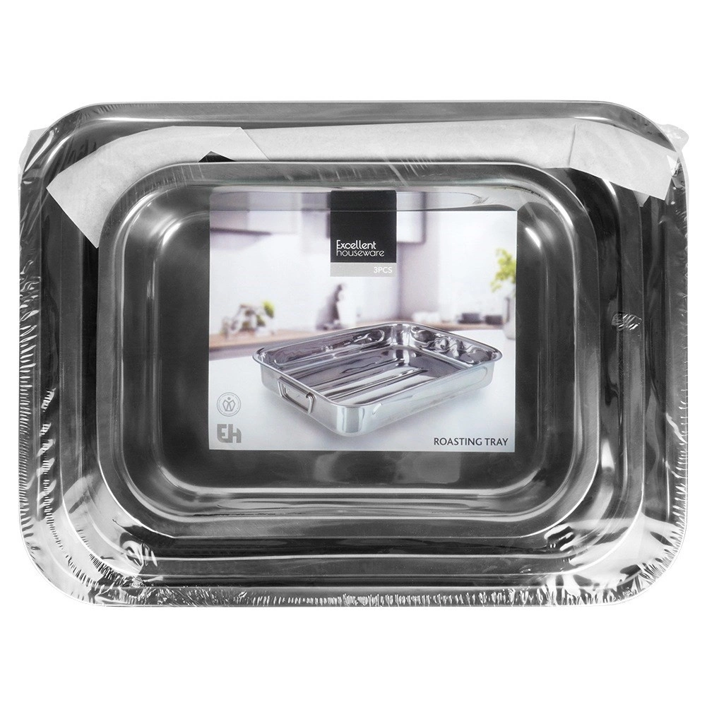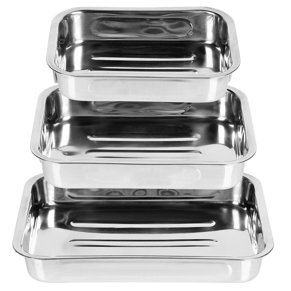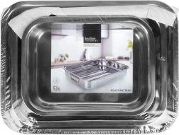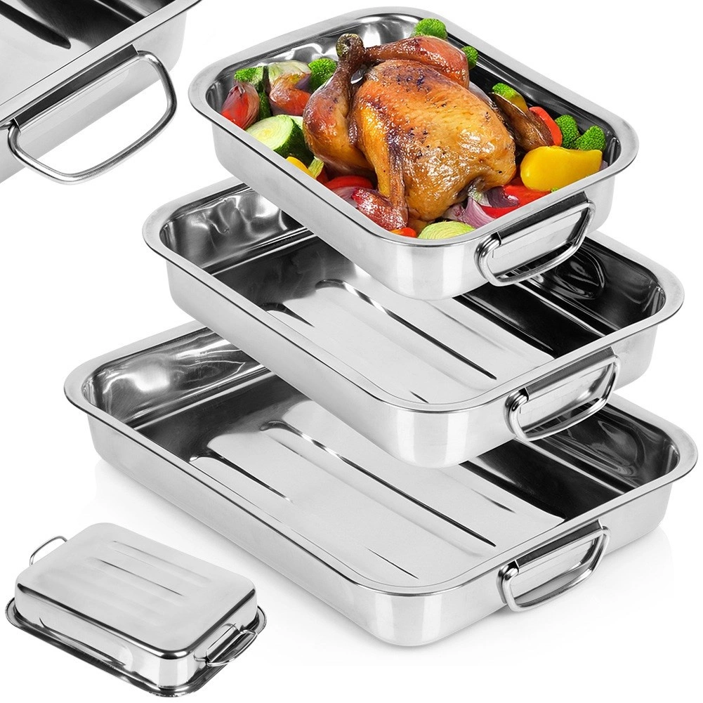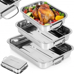 De set van drie robuuste braadsleden van gepolijst roestvrij staal biedt veelzijdig gebruik voor het braden van vlees, groenten, desserts en ovenschotels. Dankzij het gladde oppervlak zijn ze eenvoudig te reinigen en gaan ze lang mee. Geïntegreerde inklapbare handgrepen maken het in- en uitnemen uit de oven makkelijk.