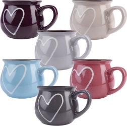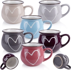 Stijlvolle set van zes keramische mokken met een inhoud van 320 ml in verschillende kleuren met een hartjesmotief. Elke mok heeft een comfortabel oor en een moderne glazuur met een donkere rand. Geschikt voor thee, koffie en cacao, en ze kunnen in de vaatwasser en in de magnetron. Hoogwaardige keramiek voor dagelijks gebruik en een tijdloos design dat mooi combineert met de rest van je servies.