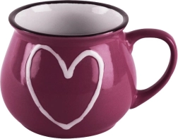 Ontdek de praktische en designvolle set van 6 keramische mokken met een inhoud van 320 ml, ideaal voor warme en koude dranken. Elke mok valt op door de afgeronde vorm, het comfortabele oor en het decoratieve hartje aan de voorkant. De glanzende glazuur en contrasterende rand geven een elegante uitstraling die prachtig staat op een gedekte tafel.