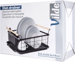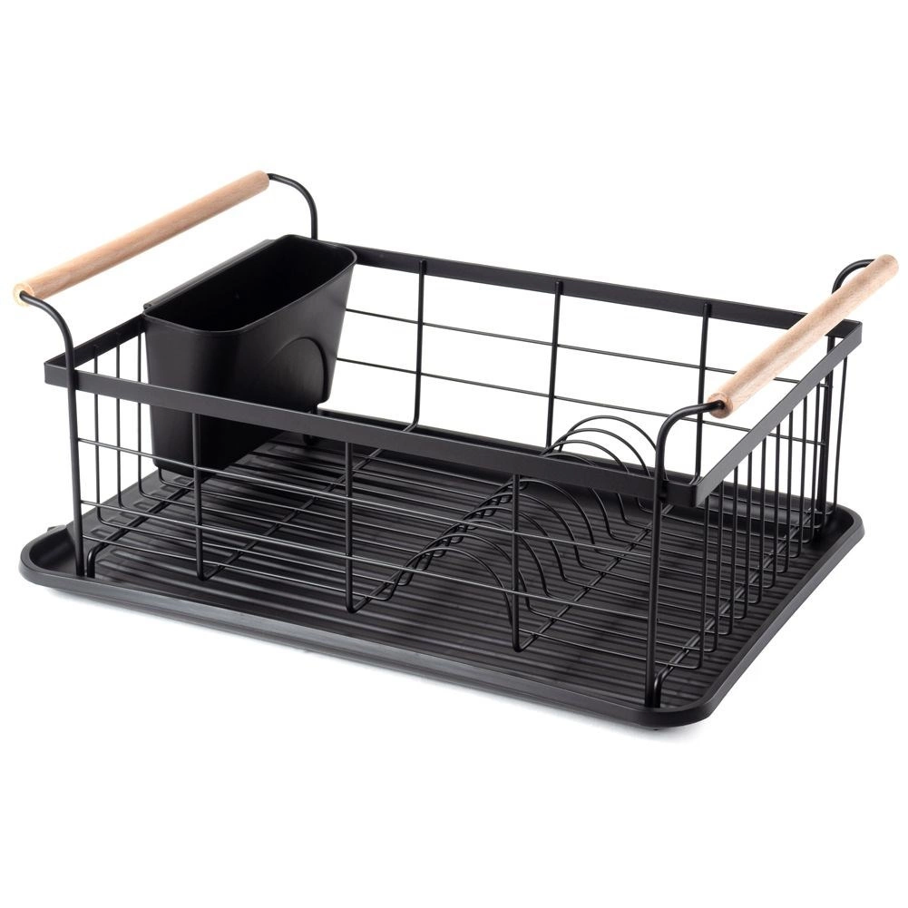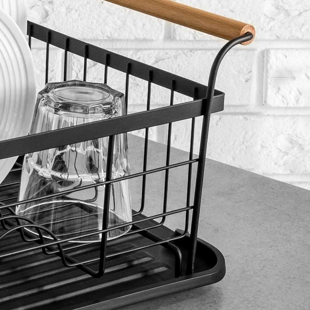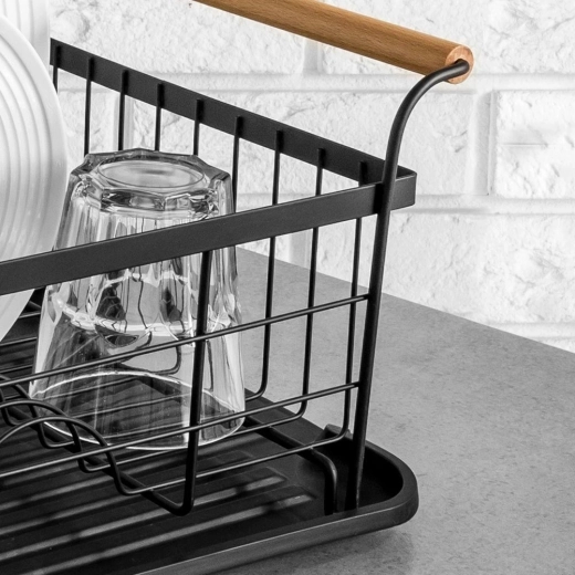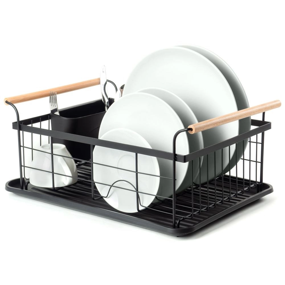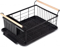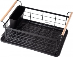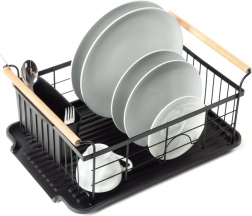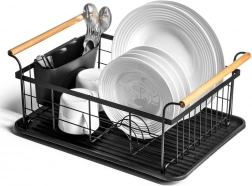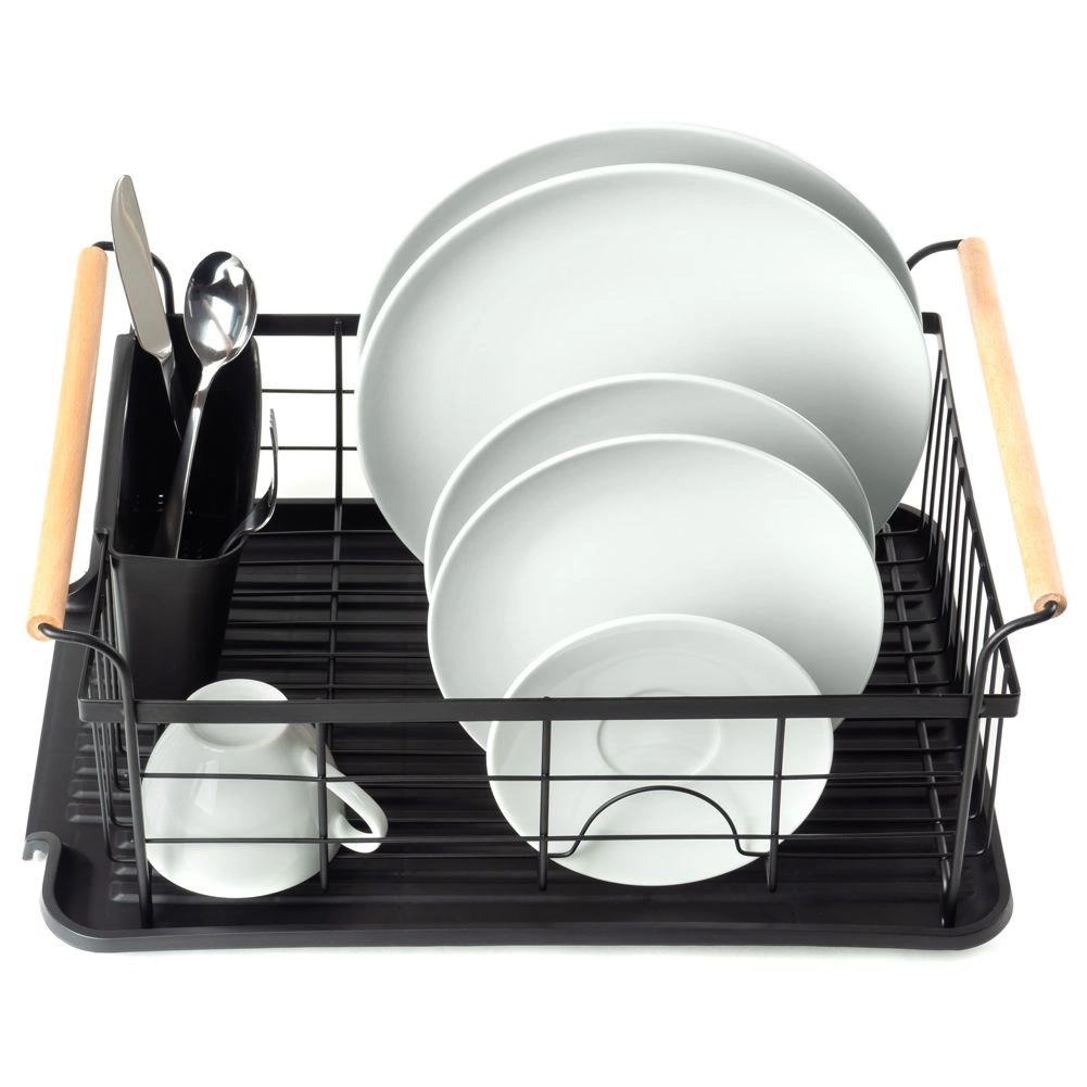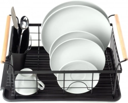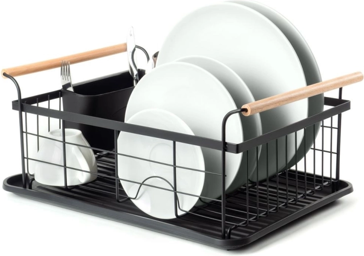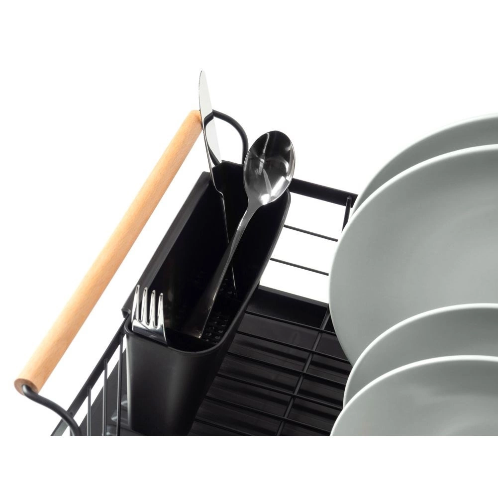 Elegant en functioneel afdruiprek van zwart gelakt metaal combineert hoge duurzaamheid met praktische details voor comfortabel drogen van borden, glazen en bestek. De geribbelde afdruipschaal vangt water op en beschermt het werkblad, terwijl het uitschuifbare bestekmandje zorgt voor orde en snel drogen.