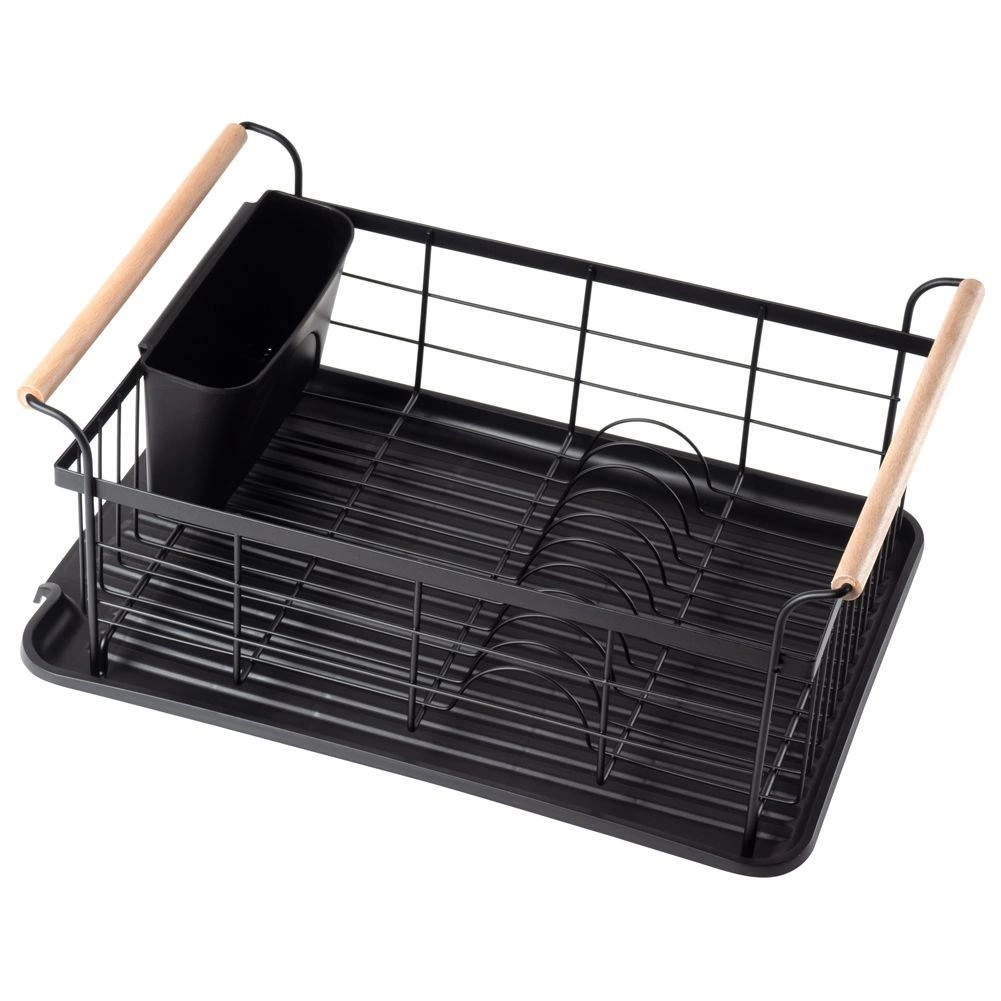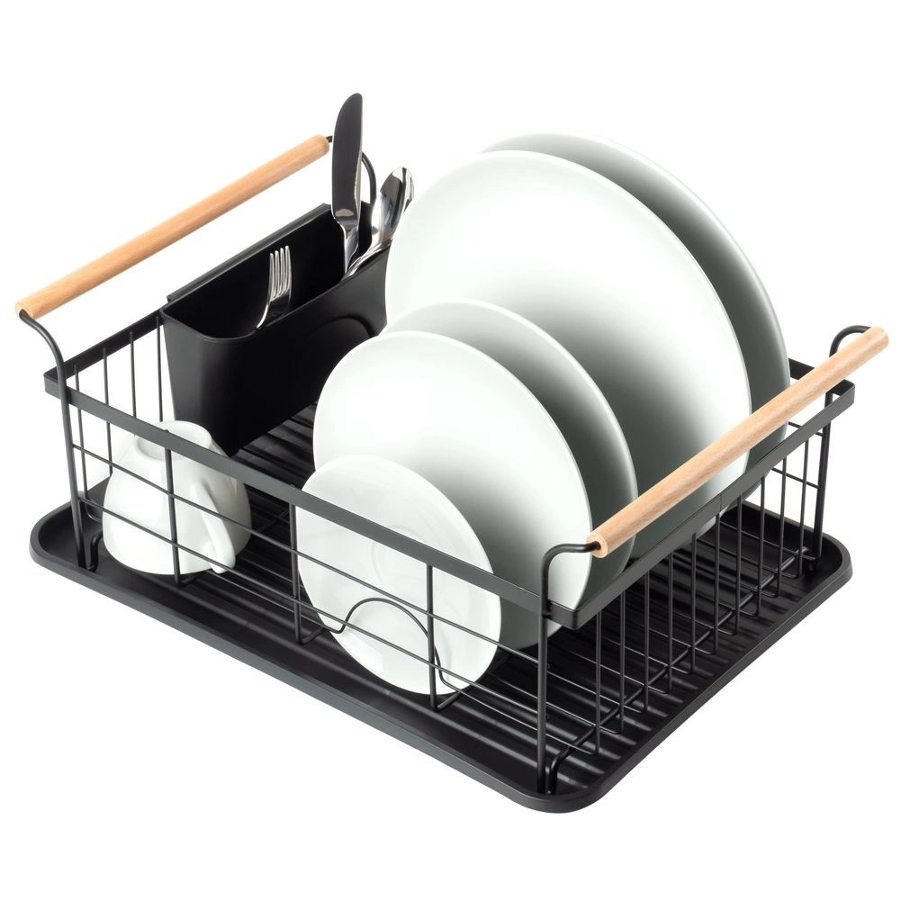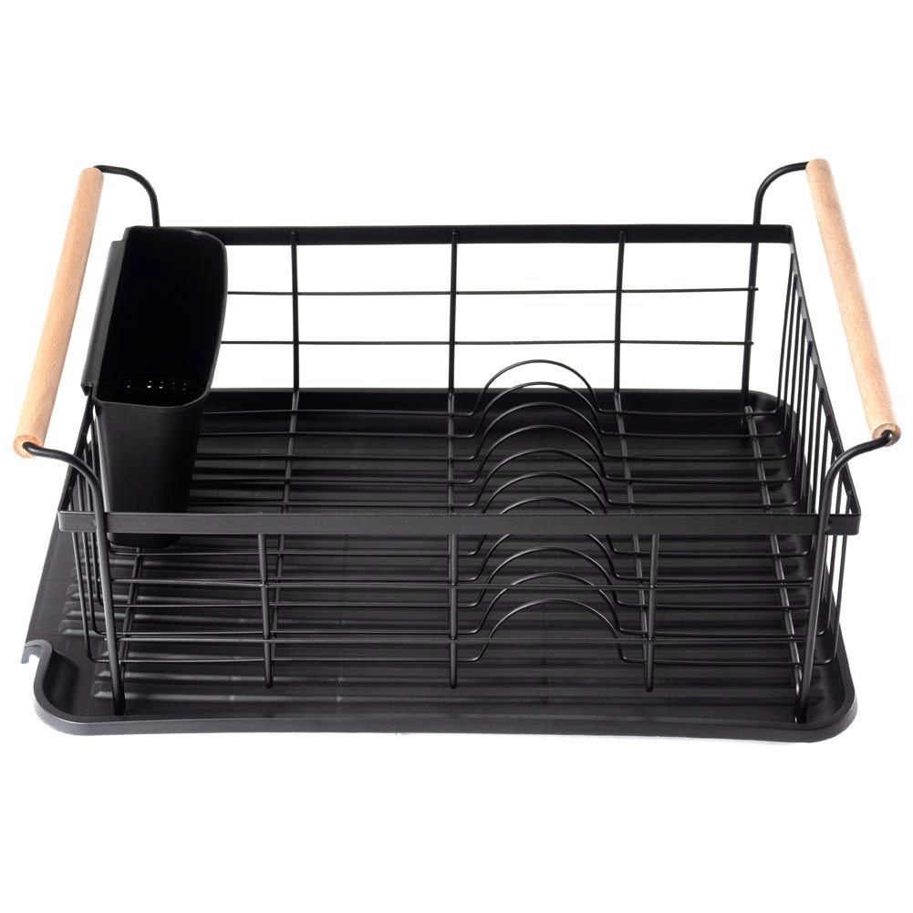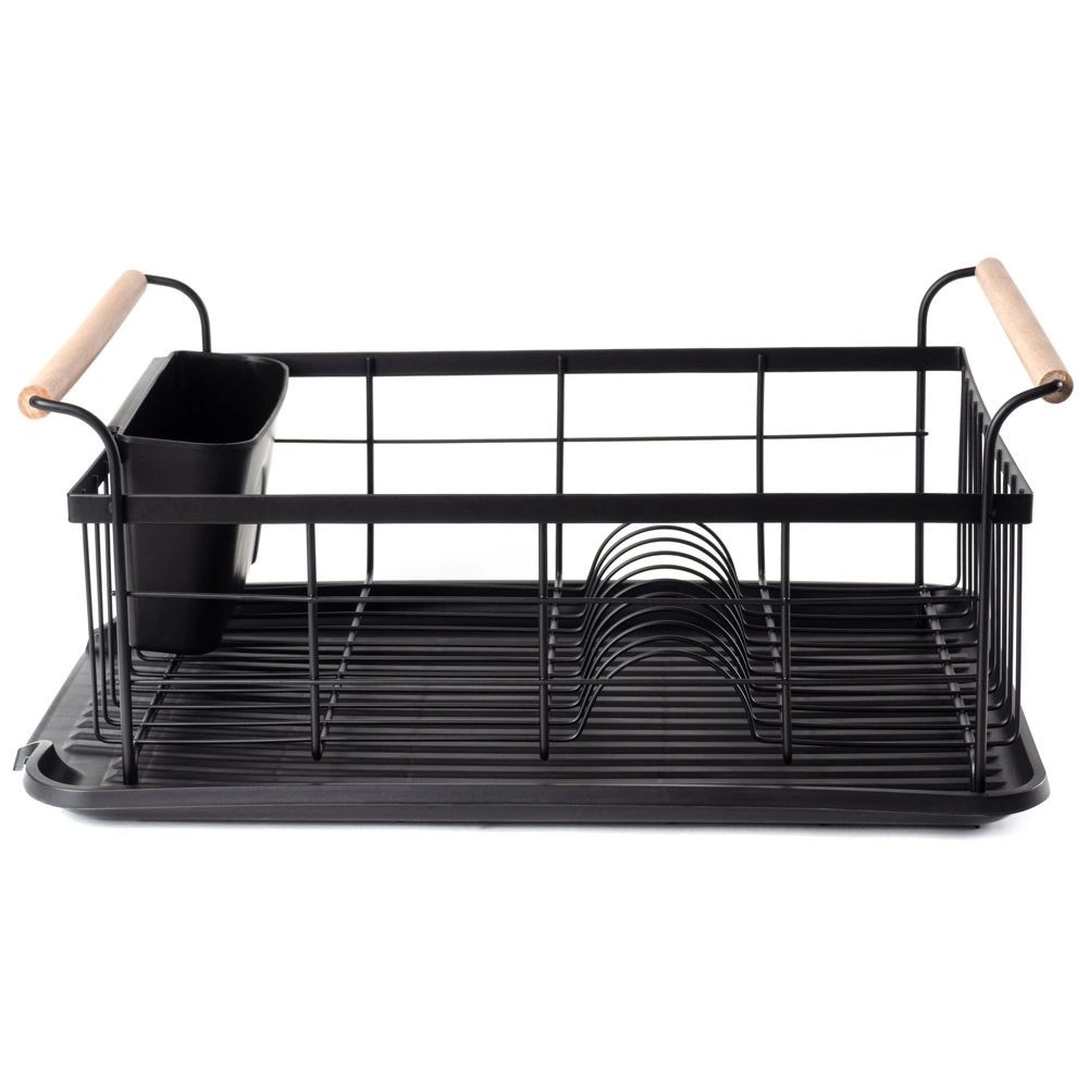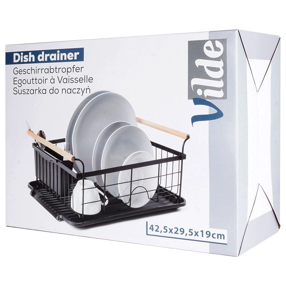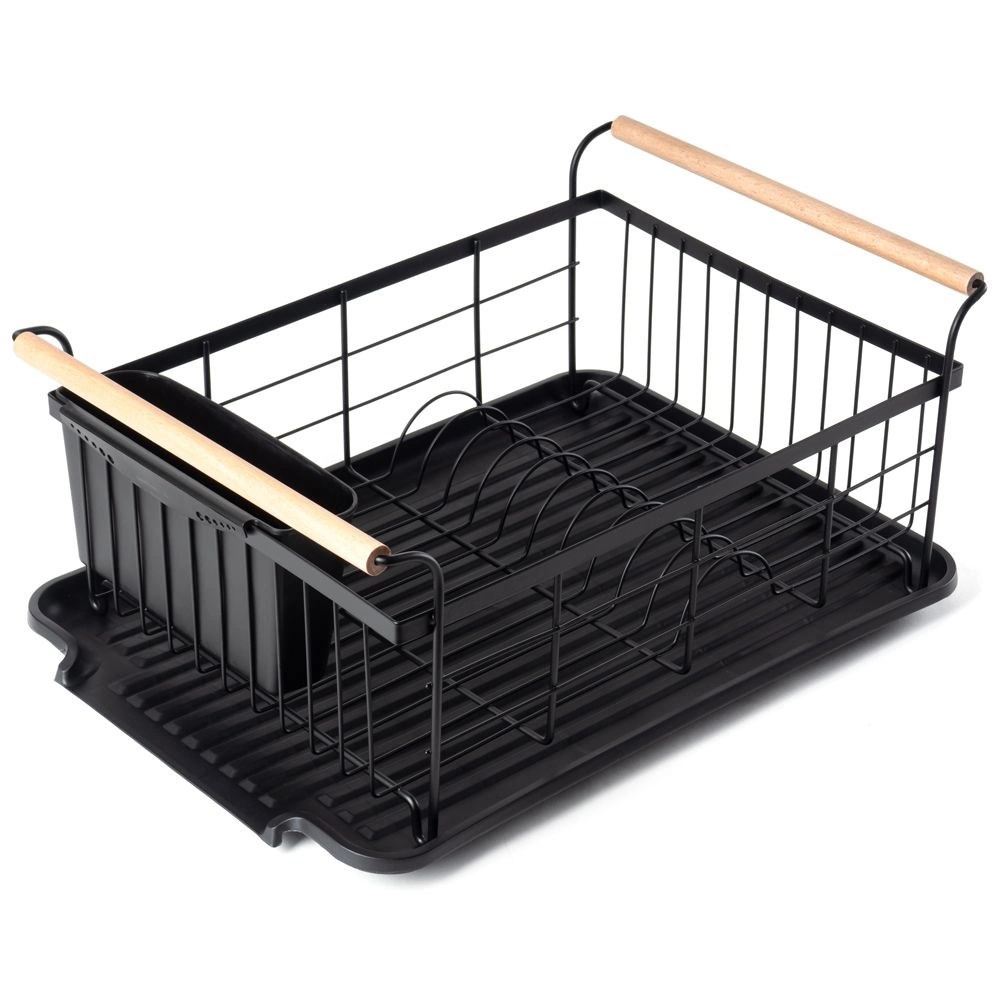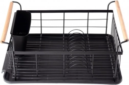 Elegant en functioneel afdruiprek van zwart gelakt metaal combineert hoge duurzaamheid met praktische details voor comfortabel drogen van borden, glazen en bestek. De geribbelde afdruipschaal vangt water op en beschermt het werkblad, terwijl het uitschuifbare bestekmandje zorgt voor orde en snel drogen.