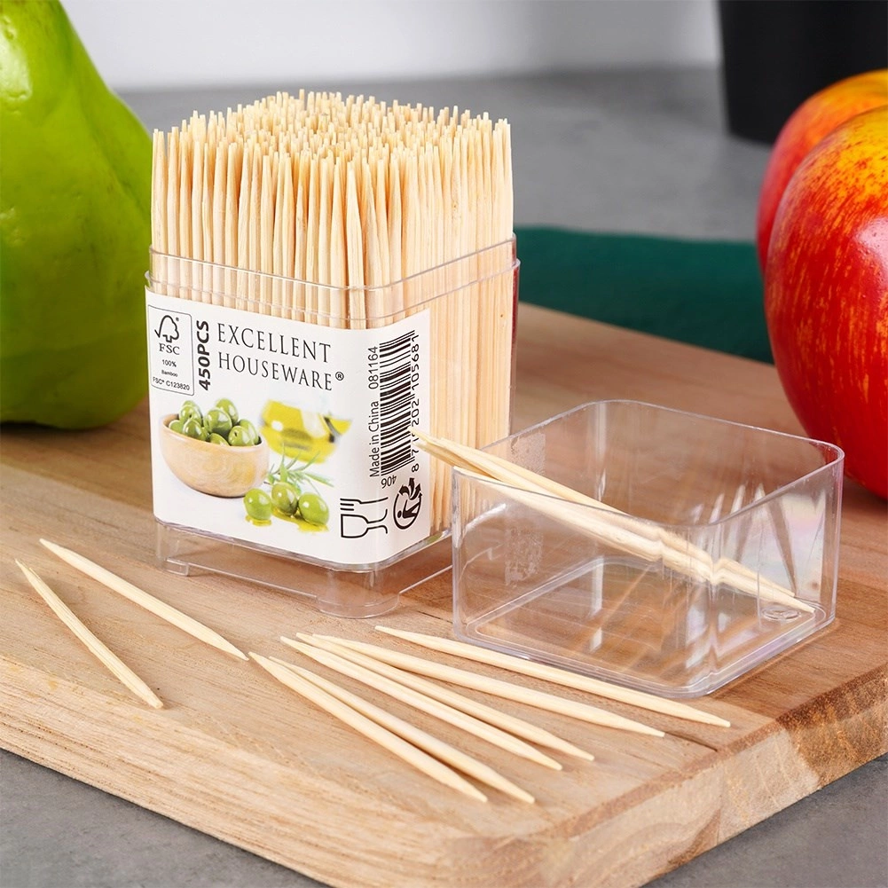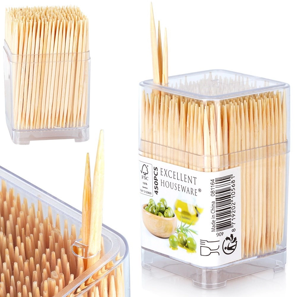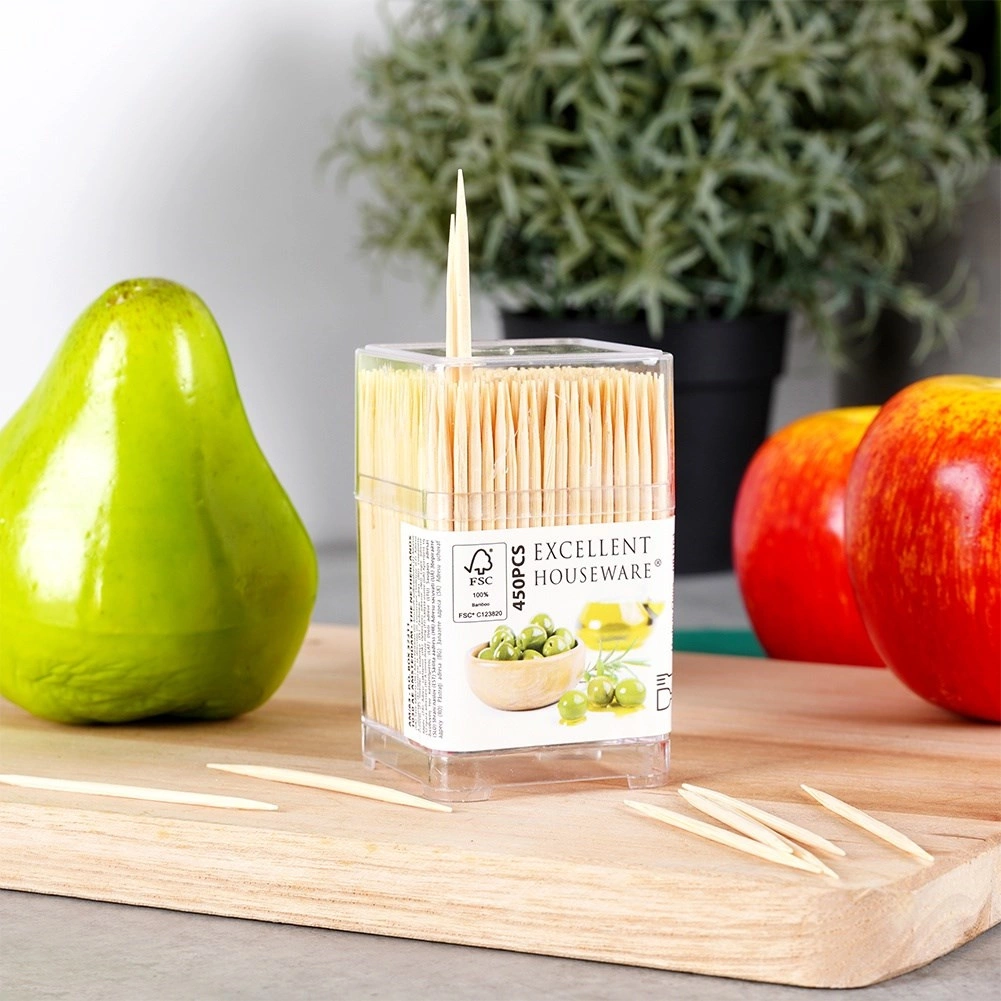 Een elegante en hygiënische oplossing voor elke gelegenheid: deze set van 450 bamboe tandenstokers in een transparant doosje maakt het serveren van snacks én de dagelijkse mondverzorging na het eten eenvoudig. Natuurlijk bamboe is stevig, glad en duurzaam, waardoor de tandenstokers niet snel breken en prettig in gebruik zijn.