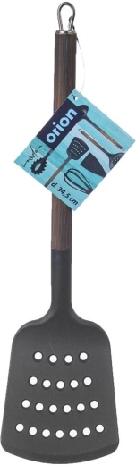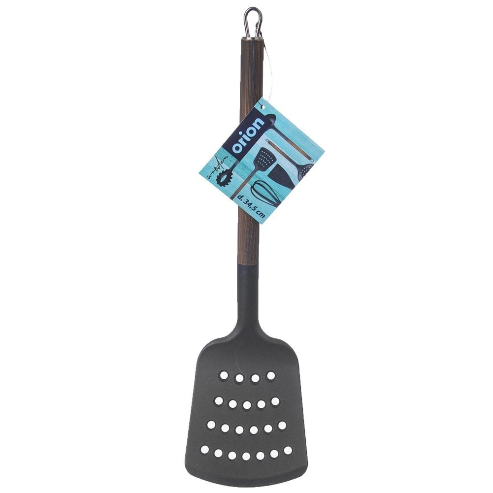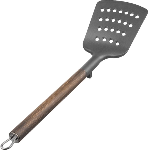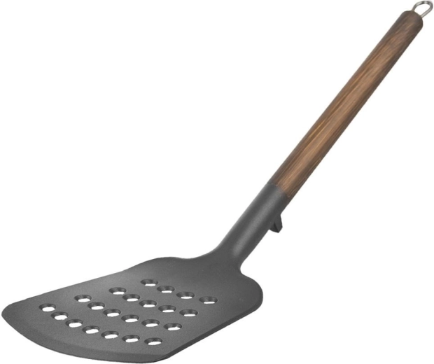 De WOODEN-spatel met afmetingen 34,5 × 9 cm is gemaakt van hoogwaardig PBT-thermoplast, gekenmerkt door hoge stijfheid en duurzaamheid. De metalen handgreep met een afwerking in houtdecor zorgt voor een comfortabele grip en een elegant uiterlijk dat past in zowel traditionele als moderne keukens.