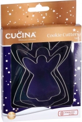 De set bevat drie engeluitstekers in oplopende maten voor een effectvolle collectie koekjes en decoraties.