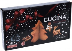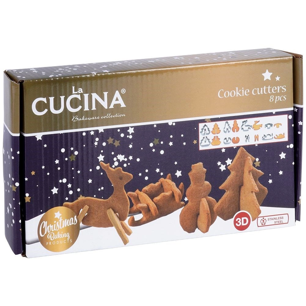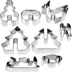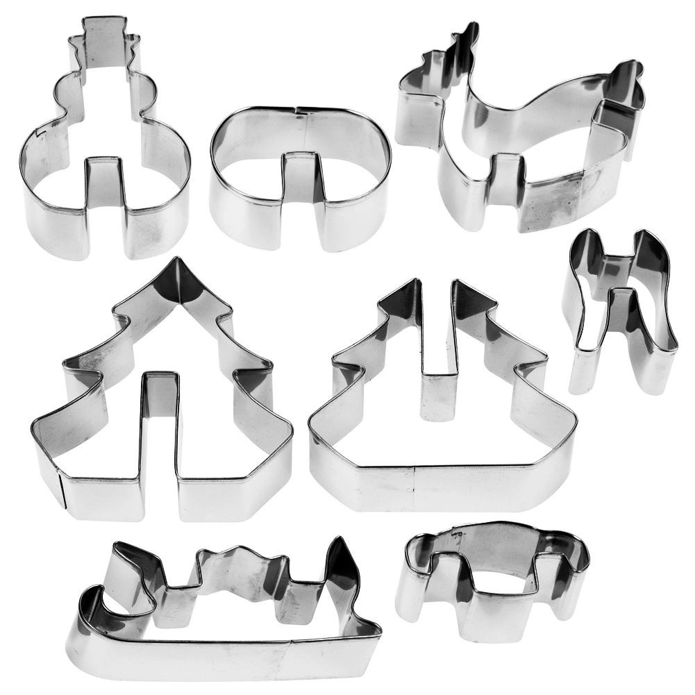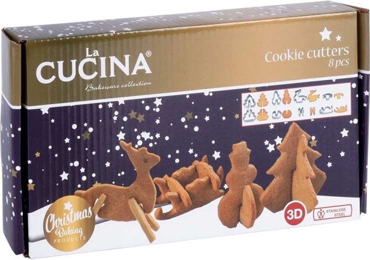De set bevat 8 stuks voor het maken van 4 verschillende 3D-motieven: kerstboom, sneeuwman, rendier en slee. De afmetingen van de losse onderdelen variëren ongeveer in breedte van 4,5–9,5 cm en in lengte van 3,5–8,5 cm. De uitstekers zijn universeel – ook geschikt voor fondant en modelleerpasta voor het decoreren van taarten en desserts.