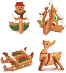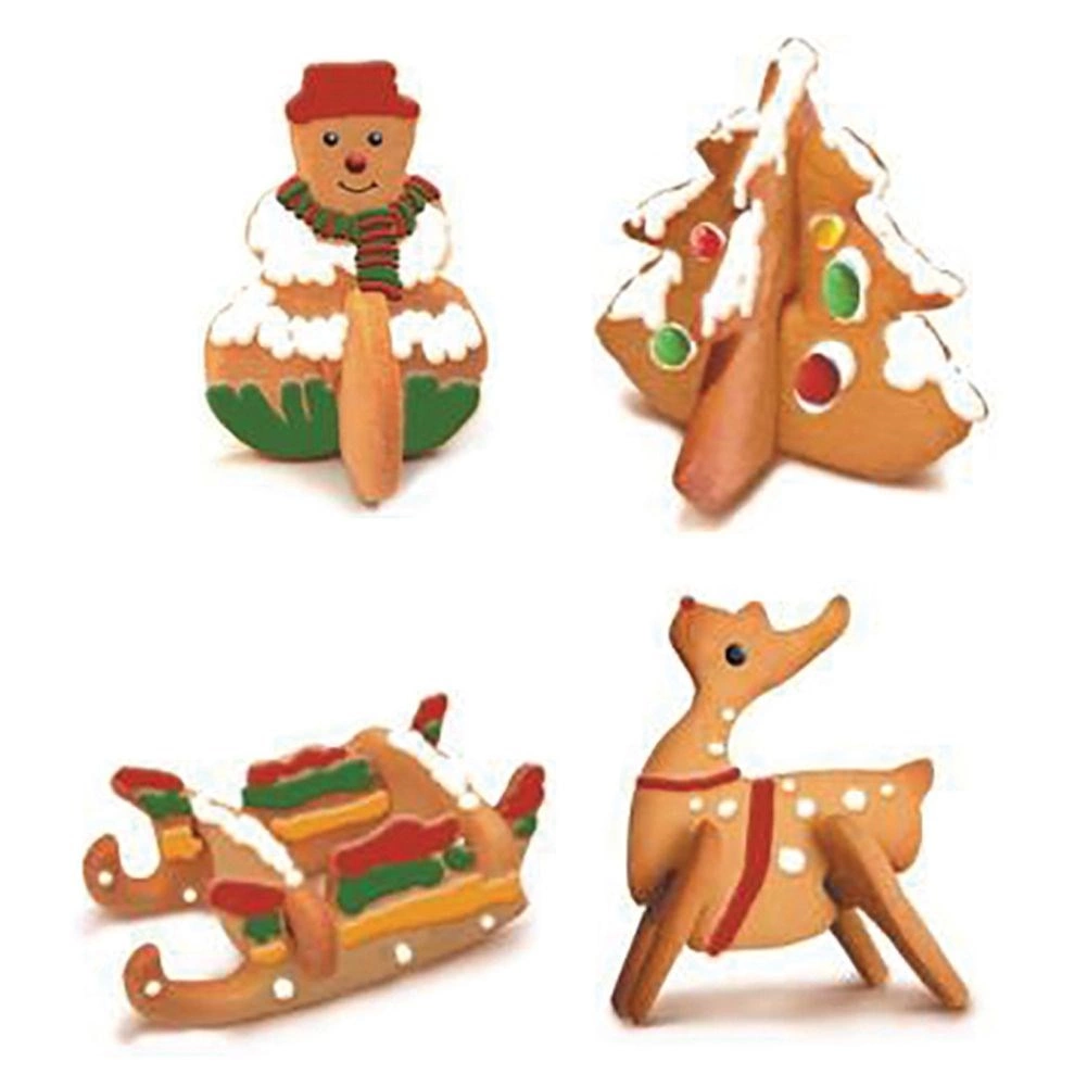 De set snijdt onderdelen uit die na het bakken in elkaar schuiven en staande figuren vormen – een boom, sneeuwman, rendier en slee. Ideaal voor feestelijk bakken en decoreren.