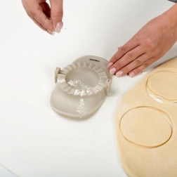 Maak eenvoudig en moeiteloos huisgemaakte pierogi. De MISTY-vorm helpt snel gelijkmatige, stevig afgesloten pierogi te maken met een stijlvolle gekartelde rand. Steek rondjes uit het deeg, bestuif de vorm licht met bloem, leg deeg en vulling erin, klap dicht en druk aan.