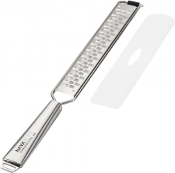De universele roestvrijstalen rasp NAVA uit de Acer-lijn is ontworpen voor precies raspen tot fijne sliertjes en vlokken. Het lange lichaam met fijne tandjes kan overweg met Parmezaan, citruszeste, knoflook, chocolade en specerijen zoals gember, kaneel of nootmuskaat. Het rubberen uiteinde onderaan beschermt pannen en schalen tegen krassen en verhoogt de stabiliteit tijdens het werken.
