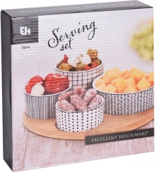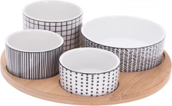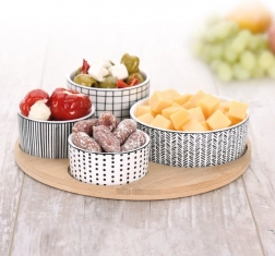 Stijlvolle 5-delige set voor dagelijks en feestelijk tafelen. Vier porseleinen schaaltjes in verschillende maten bieden de perfecte oplossing voor het serveren van nootjes, antipasti, olijven, dips of sauzen. De ronde bamboe plank met uitsparingen voor elk schaaltje zorgt voor veilig en comfortabel dragen zonder verschuiven.