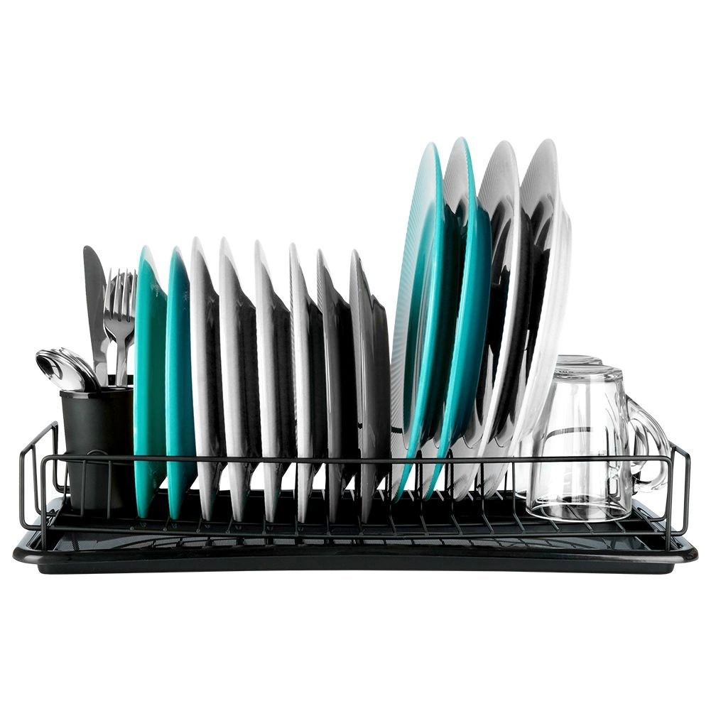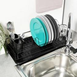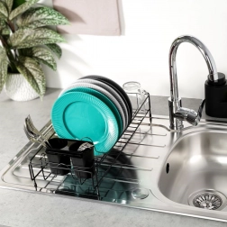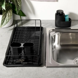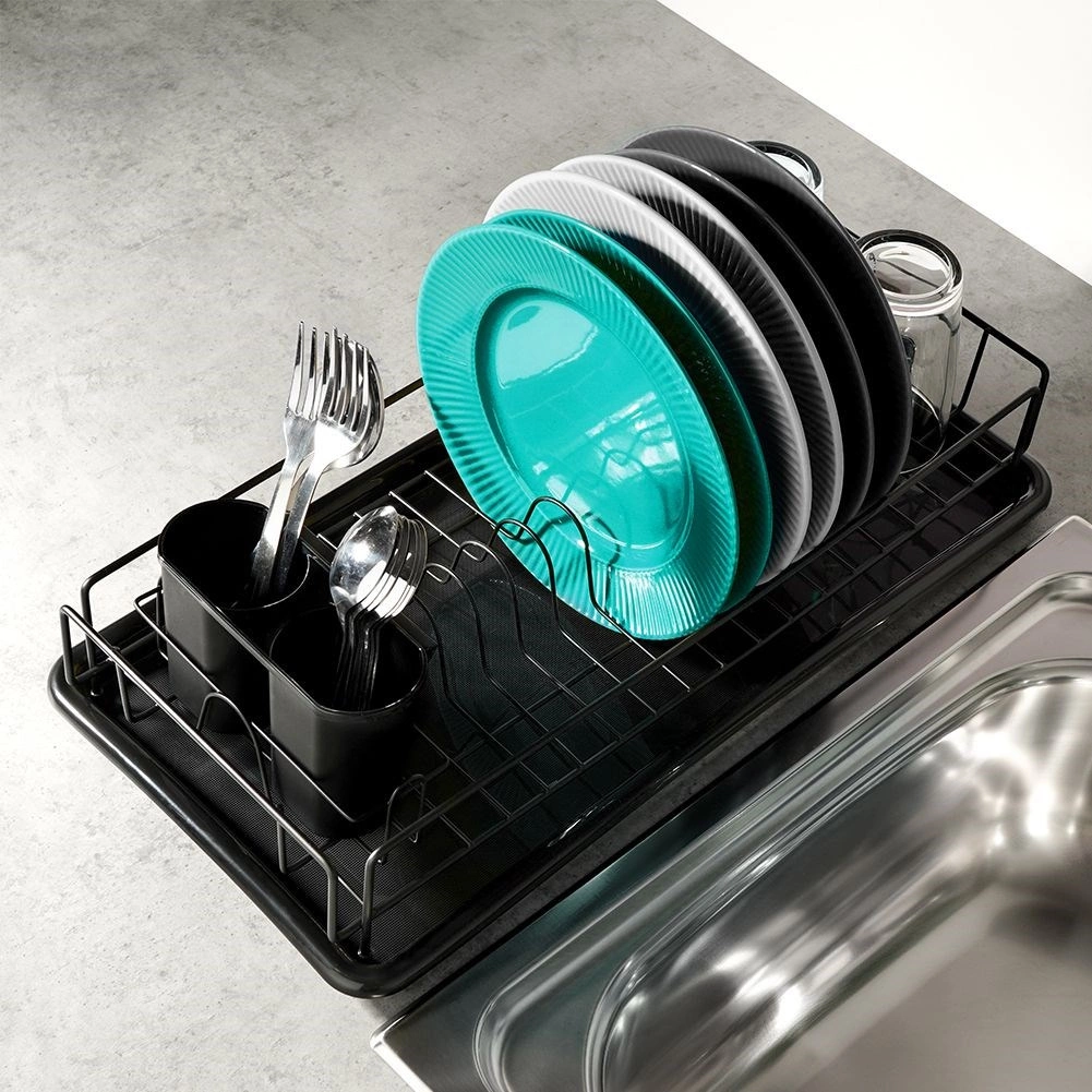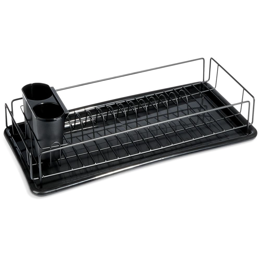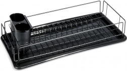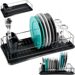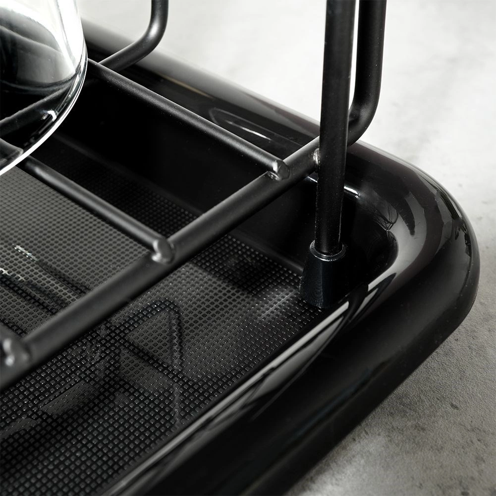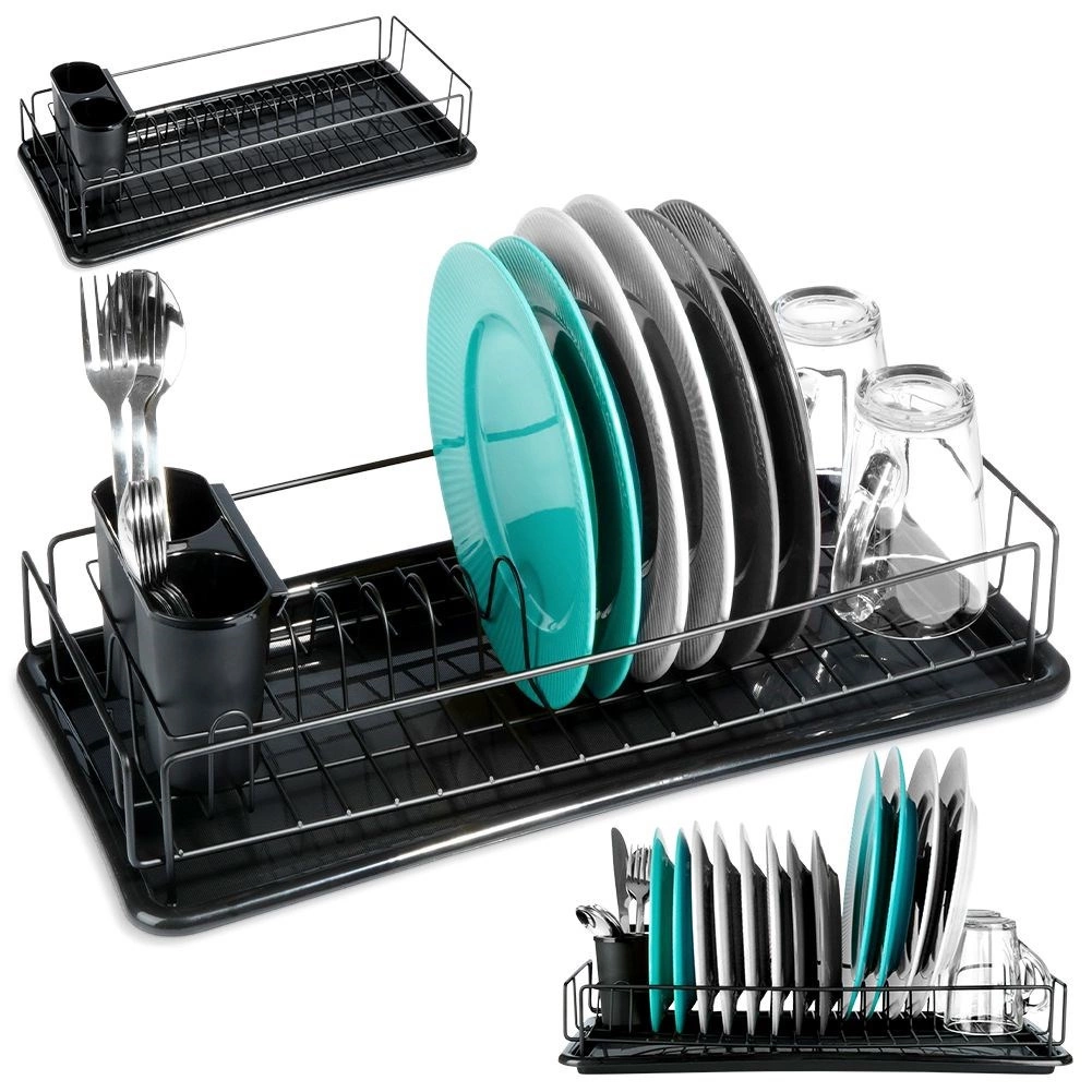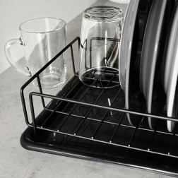 Elegant en compact afdruiprek in het zwart is een praktische toevoeging aan elke keuken. Dankzij het stevige metalen frame en de uitneembare kunststof lekbak blijft je werkblad schoon en droog. De doordachte indeling met houders voor borden en ruimte voor mokken zorgt voor snel en hygiënisch drogen.