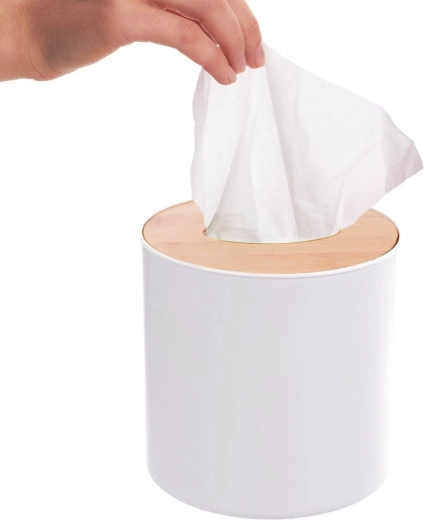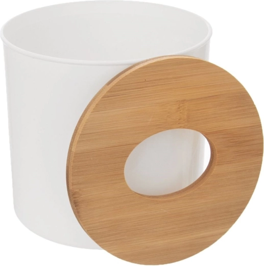 Deze kleine maar praktische prullenbak is perfect voor dagelijks klein afval. Combineert een witte kunststof behuizing met een bamboe deksel met centrale opening voor snel en hygiënisch weggooien. Dankzij de compacte afmetingen past hij op een plank, vensterbank of werkblad.
