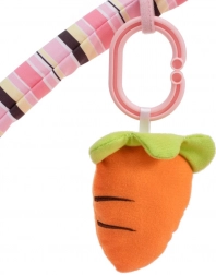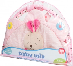 Het Baby Mix speelkleed Konijntje geeft je baby plezier in het ontdekken van kleuren, vormen en geluiden. Twee gekruiste bogen met hangende speeltjes nodigen uit om het hoofdje op te tillen en te grijpen, wat op natuurlijke wijze de nek- en rugspieren versterkt. Het luchtige kussen en het zachte suède-achtige materiaal creëren een comfortabele en veilige omgeving voor spel en rust.