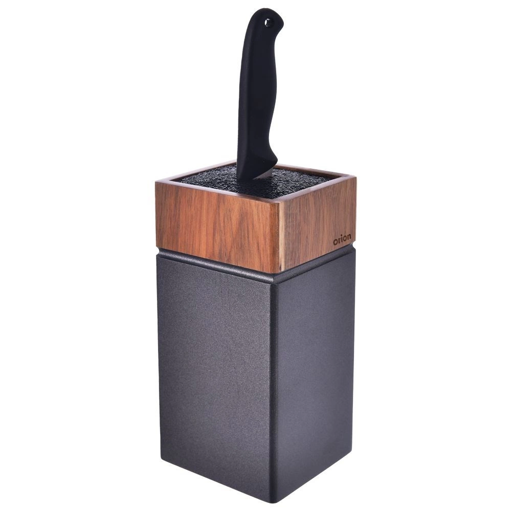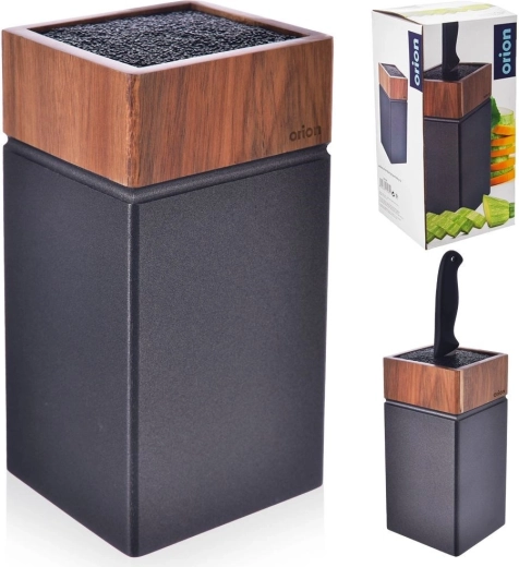 De WOODEN messenhouder combineert solide acaciahout met duurzaam kunststof in elegant zwart. De universele inzet met kunststof vezels maakt het mogelijk messen van elke vorm en grootte te plaatsen zonder ze te beschadigen. Dankzij de compacte afmetingen 11 × 10,5 × 22,5 cm past hij op elk aanrecht en biedt tegelijk veilige en overzichtelijke opslag.