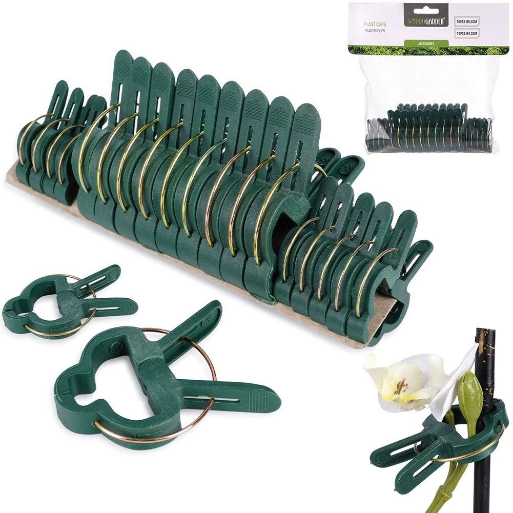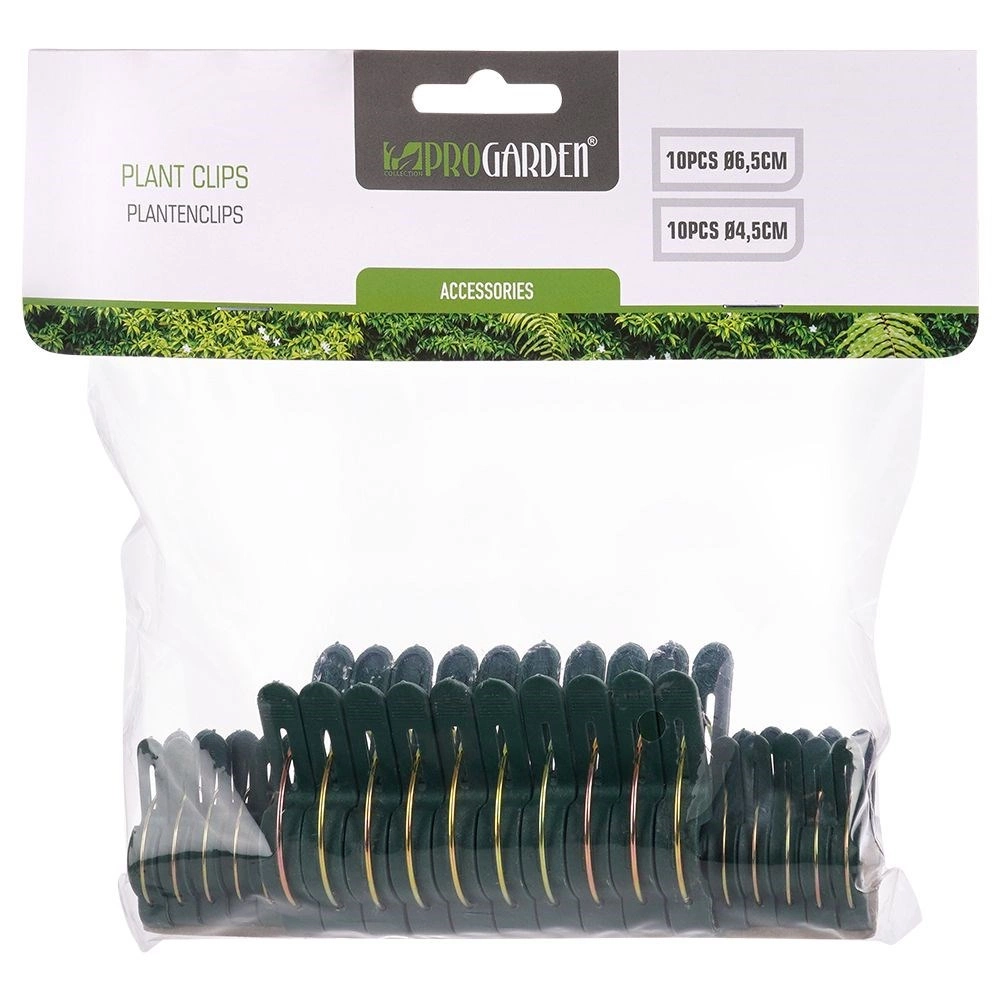 De PROGARDEN set tuinclips in twee maten (10× 4,5 cm en 10× 6,5 cm) maakt het aanbinden en vormen van planten thuis en in de tuin eenvoudig. Het veermechanisme met zekere grip houdt stengels aan stokken of rasters zonder ze te pletten.