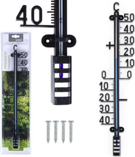 De thermometer is gemaakt van hoogwaardige, duurzame kunststof in elegant zwart, bestand tegen regen, zon en vorst. Montage is eenvoudig – de bevestigingsgaten maken snelle montage aan gevel, houten hek of tuinoveral mogelijk.