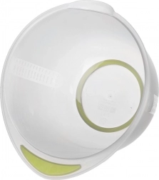 Deze lichte maar toch stevige kom met een inhoud van 1,5 liter is een uitstekende hulp voor dagelijks koken en bakken. De geïntegreerde maatschaal maakt precies afmeten van ingrediënten direct in de kom mogelijk, zodat je geen extra gerei nodig hebt. De hoge wanden beperken spatten bij intensief kloppen.
