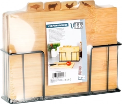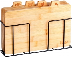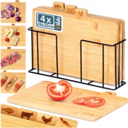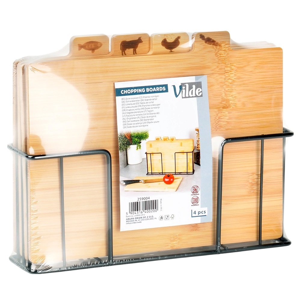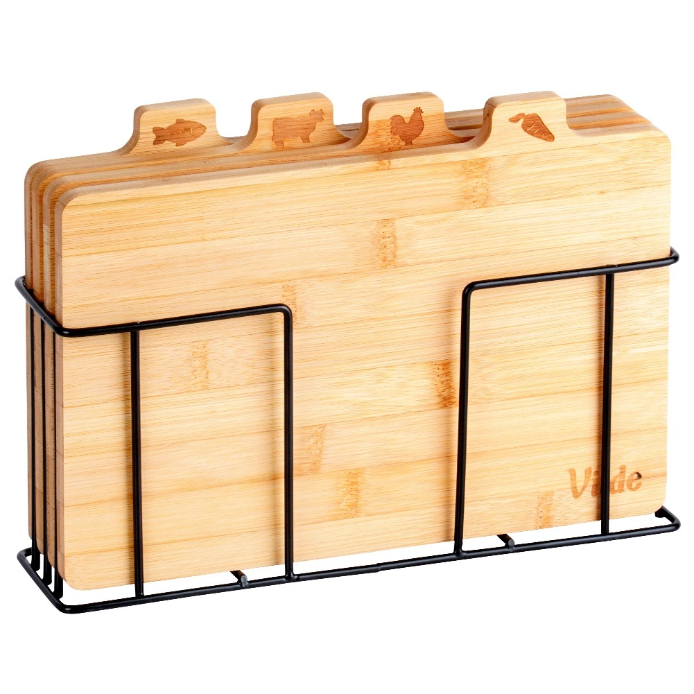 Met deze set bamboe snijplanken houdt u de keuken perfect georganiseerd. Vier afzonderlijke planken met praktische tabs en iconen maken duidelijk waarvoor ze bedoeld zijn – voor groenten, gevogelte, vlees en vis – en ondersteunen zo een hygiënische voedselbereiding. De stabiele metalen standaard in het zwart zorgt ervoor dat de planken altijd binnen handbereik en netjes opgeborgen zijn.