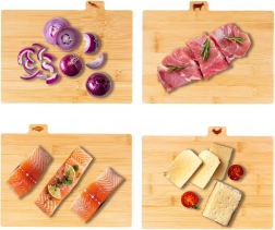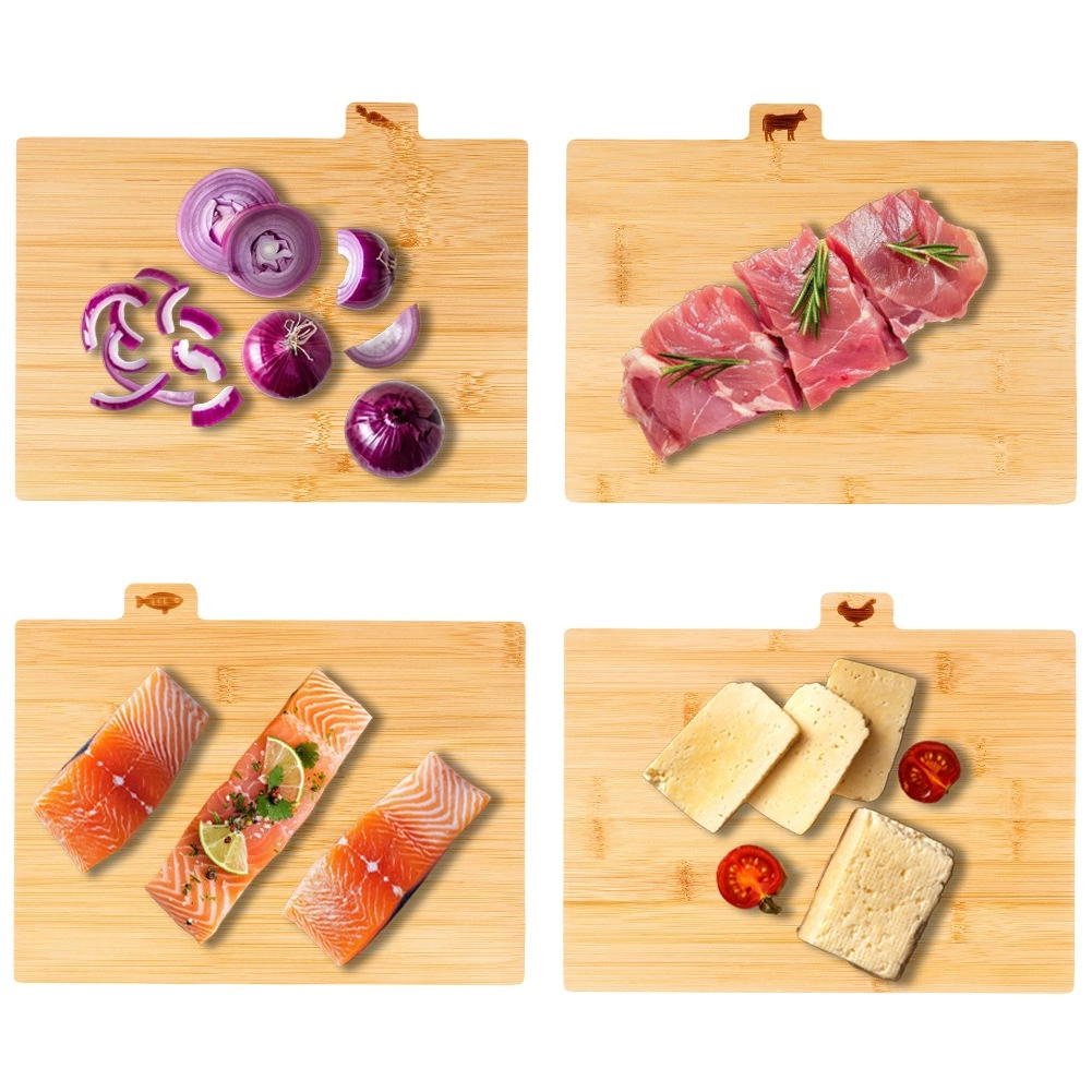 Elke snijplank heeft een tab met een gegraveerd icoon voor een specifiek type voedsel – groenten, gevogelte, vlees en vis. Zo voorkomt u eenvoudig kruisbesmetting en blijft het koken netjes en schoon.