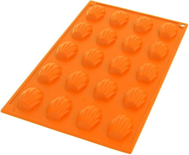 Praktische siliconen bakvorm voor koekjes in de vorm van schelpjes, voor tot 20 stuks per bakplaat. Gemaakt van duurzaam siliconen in de kleur oranje, geschikt voor oven, magnetron en vriezer en eenvoudig schoon te maken – vaatwasserbestendig.