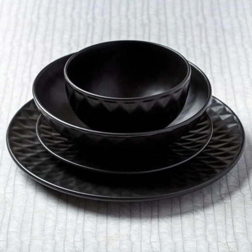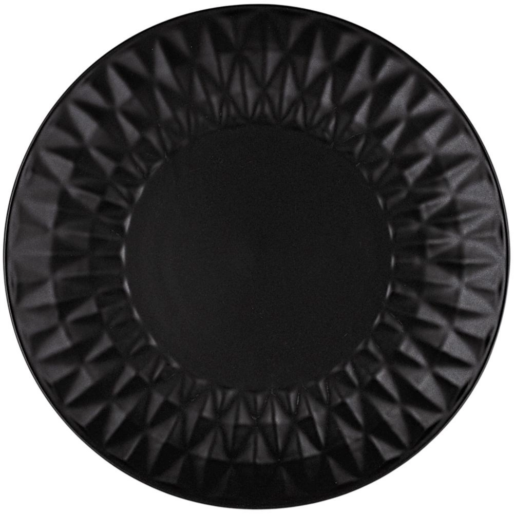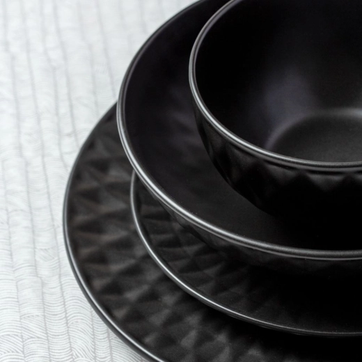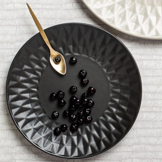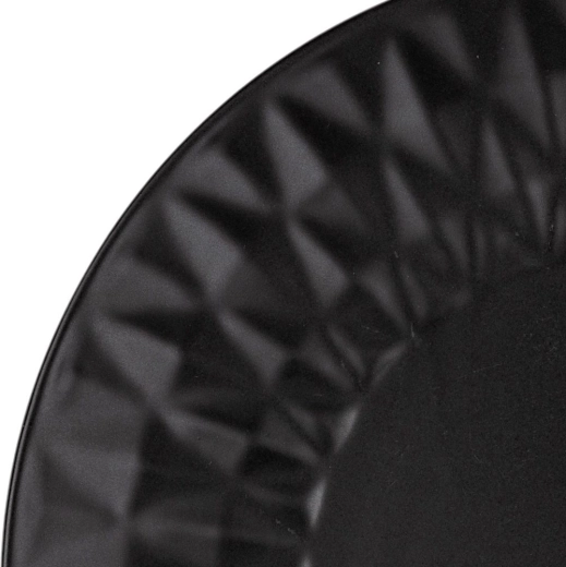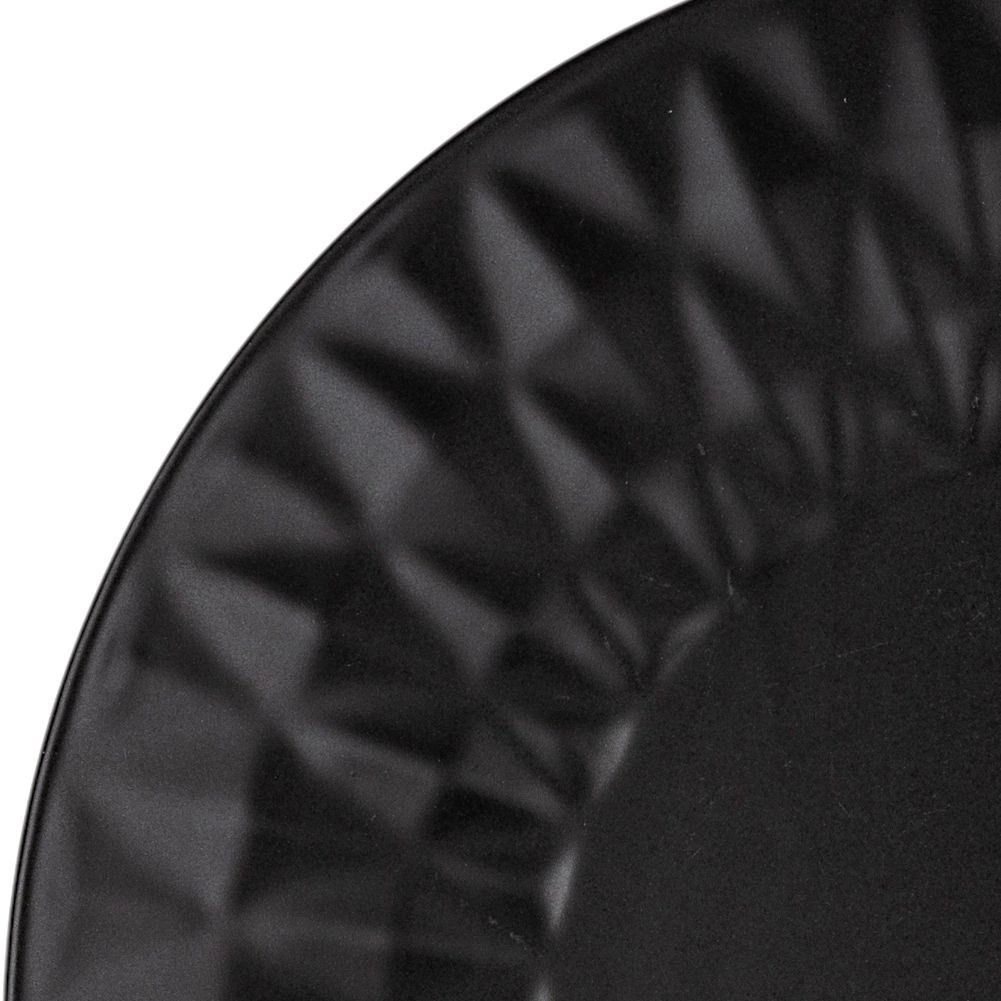 De geometrisch gestructureerde rand en de matzwarte afwerking geven je tafelsetting een uitgesproken, eigentijdse uitstraling.