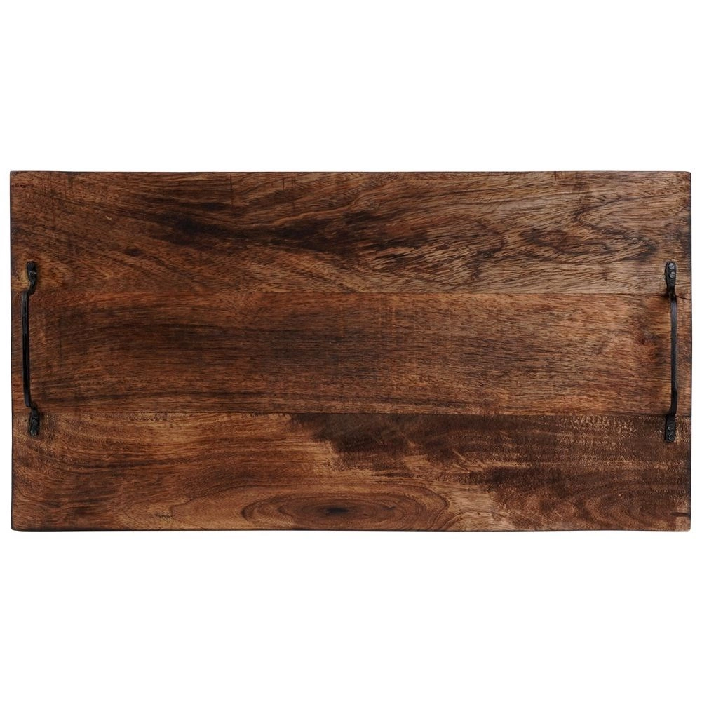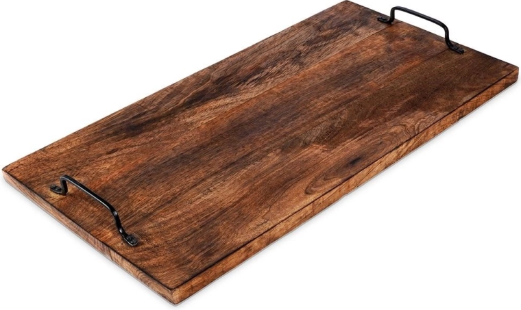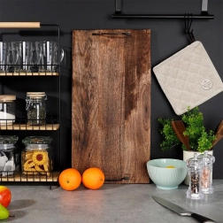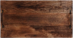 Twee metalen grepen zorgen voor een veilige grip en comfortabel dragen van de keuken rechtstreeks naar de tafel. Het oppervlak met uitgesproken houttekening en een verweerde uitstraling geeft je tafelsetting een rustieke touch en een moderne stijl.