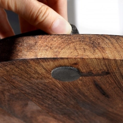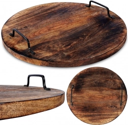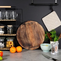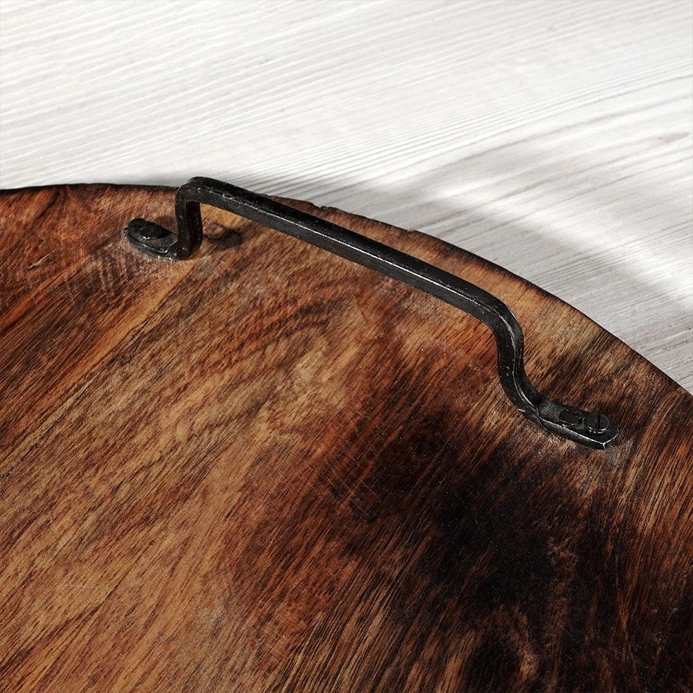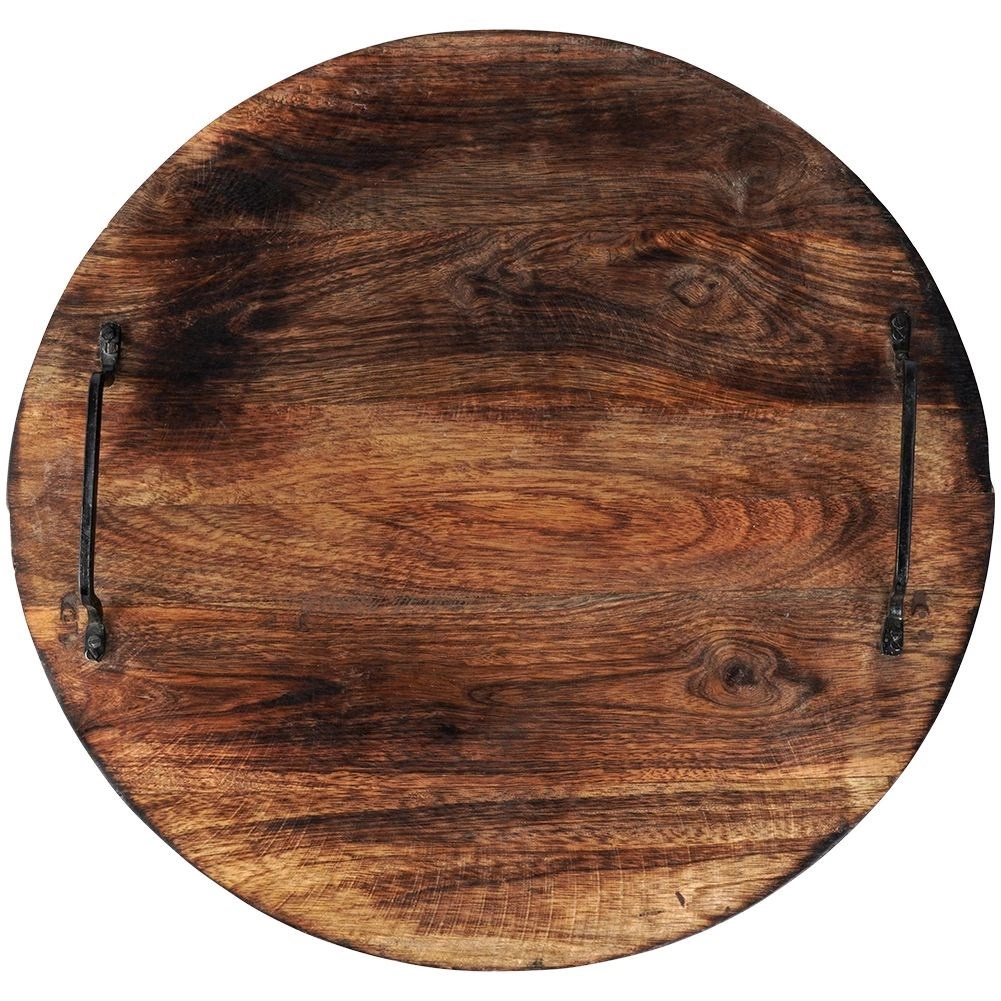 Deze ronde serveerschaal van hoogwaardig mangohout combineert functionaliteit met design. Perfect voor het serveren van delicatessen, hapjes en drankjes, en dankzij de robuuste constructie ook geschikt als plank in de dagelijkse keuken. De natuurlijke houtnerf en licht verouderde look maken dit stuk tot een opvallende aanvulling op de eettafel.