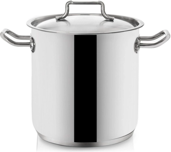 Premium roestvrijstalen pan met een diameter van 24 cm en een inhoud van 11 l met deksel, ideaal voor dagelijks koken en grotere porties. Gemaakt van hoogwaardig roestvrij staal 18/10 met een gepolijste afwerking, voorzien van een meerlaags akuthermische bodem voor zuinige en gelijkmatige warmteverdeling, geschikt voor alle soorten kookplaten inclusief inductie en ook te gebruiken in de oven.