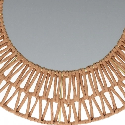 Deze ronde wandspiegel is een designaccessoire in natuurlijke stijl. Het frame van gevlochten papier op een stevig metalen frame creëert een opvallende structuur die uitblinkt in interieurs in boho-, Scandinavische of moderne minimalistische stijl. Neutrale beige-grijze tinten laten zich gemakkelijk combineren met verschillende kleuren en materialen.