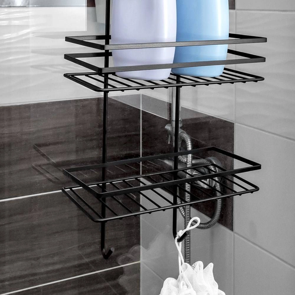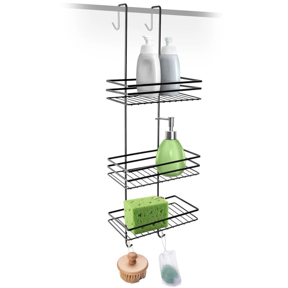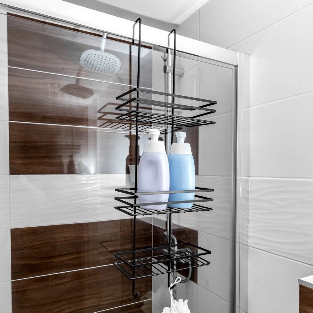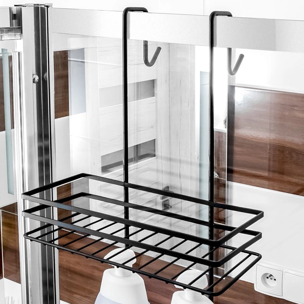 Praktisch hangend doucherek in elegante zwarte kleur houdt al je essentials overzichtelijk binnen handbereik. Biedt drie ruime planken voor shampoos en gels, vier haken voor sponzen en borstels en montage zonder boren door het over de bovenrand van glazen douchedeuren te hangen. Duurzaam metaal met poedercoating zorgt voor een lange levensduur en eenvoudig onderhoud.