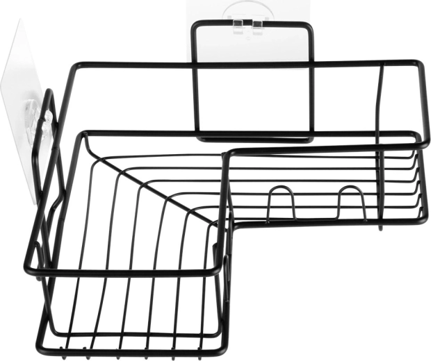 Praktische hoekplank voor douche en badkamer van duurzaam, zwart gepoedercoat metaal voor overzichtelijke opslag van cosmetica en accessoires. Biedt borenloze montage met zelfklevende pads, roestbestendige afwerking en een open draadconstructie voor snelle waterafvoer. Ook ideaal in de keuken voor kruiden en kleinigheden.